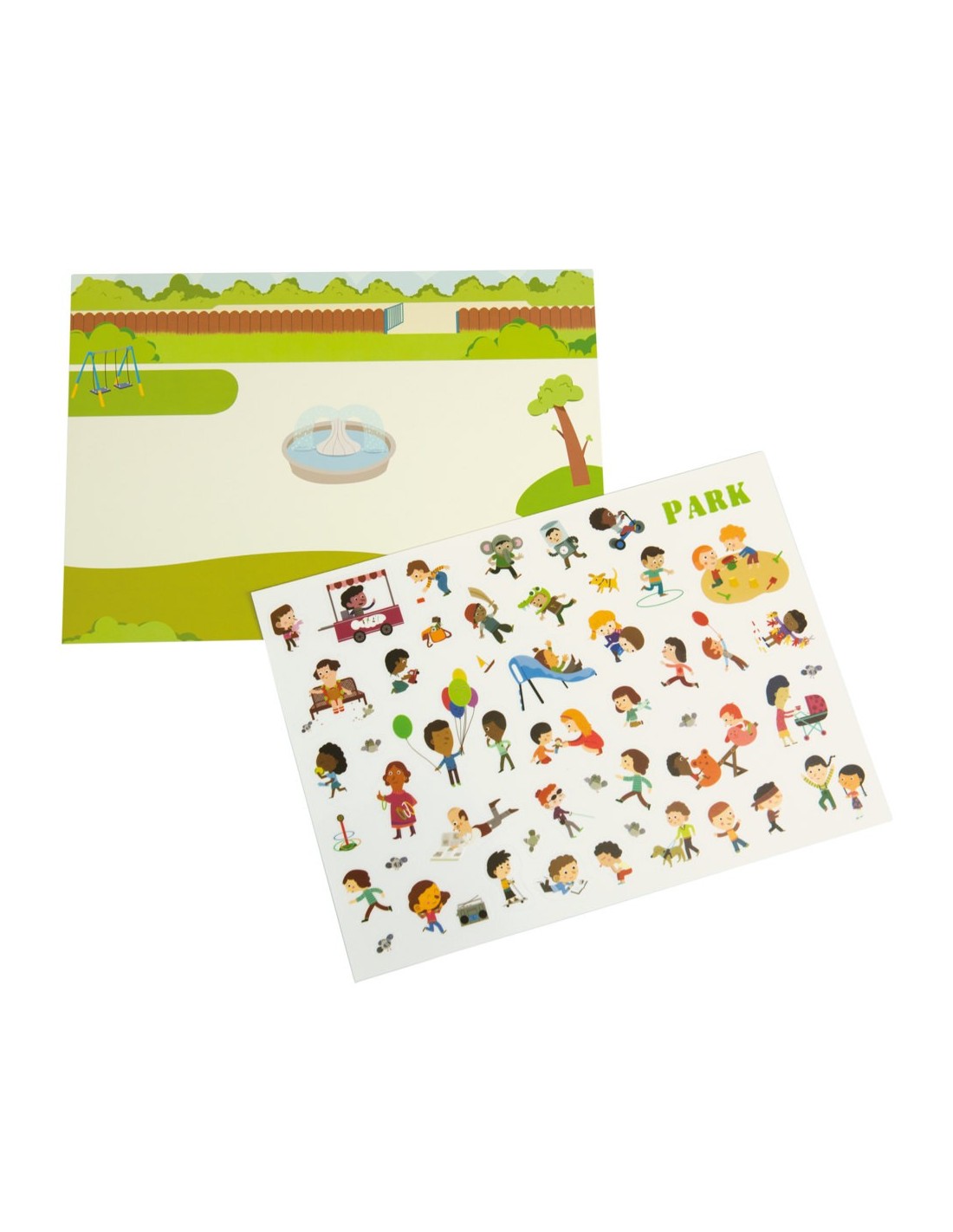 Descobreix tots els racons d'aquesta fantàstica ciutat! En aquest pack trobaràs més de 170 adhesius reutilitzables de personatges, objectes i animals. Aquests stickers els podràs enganxar a les 4 diferents escenes de fons que trobaràs també en aquest joc. Les escenes són: el circ, el parc, la platja i la neu. Podràs imaginar diferents històries que els passen als diferents personatges i animals. Les il·lustracions són realment boniques, així que serà un gust jugar amb aquests stickers. Un joc perfecte per desenvolupar les habilitat motrius fines, la coordinació ull-mà, el pensament narratiu, les habilitats de comunicació i l'expressió creativa.