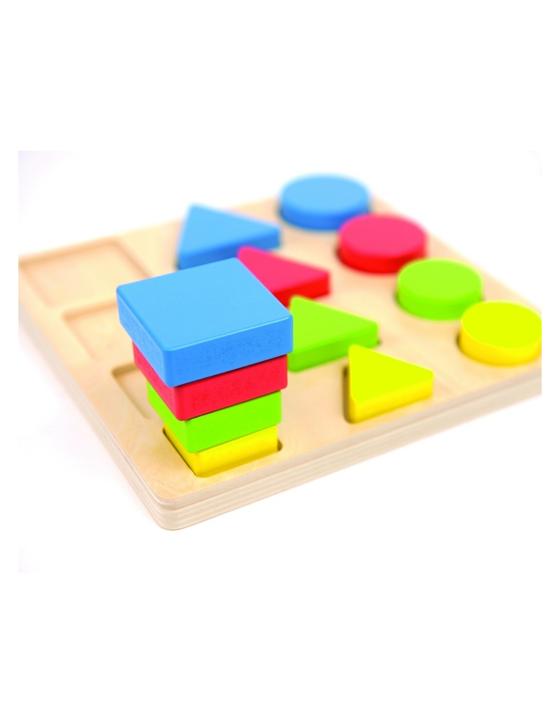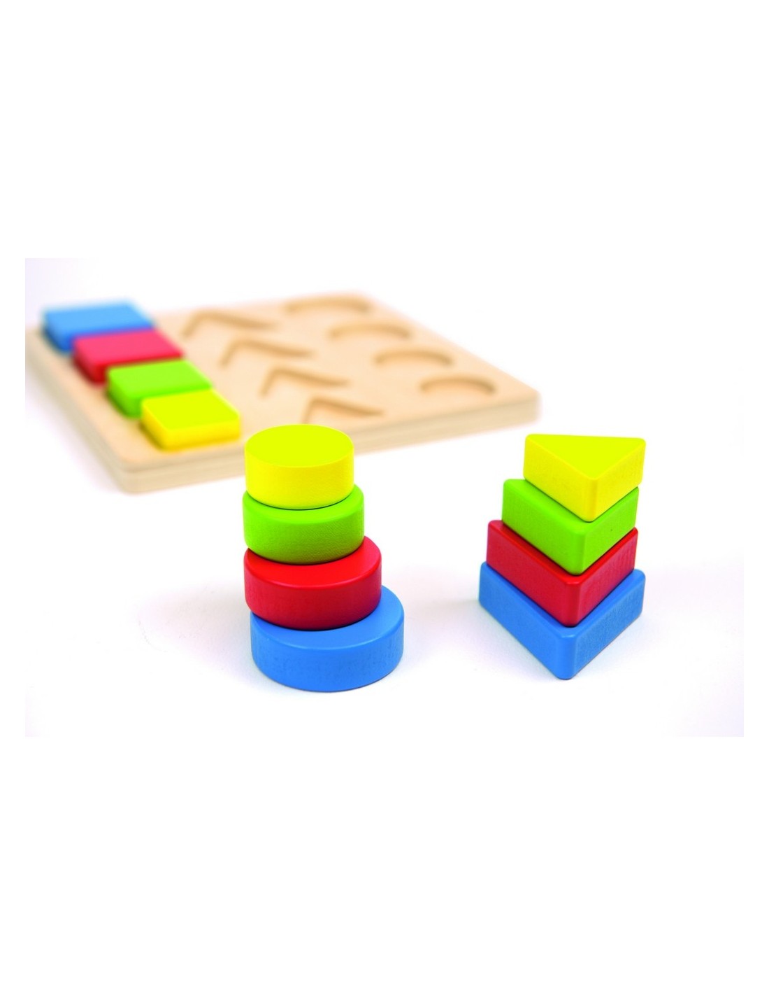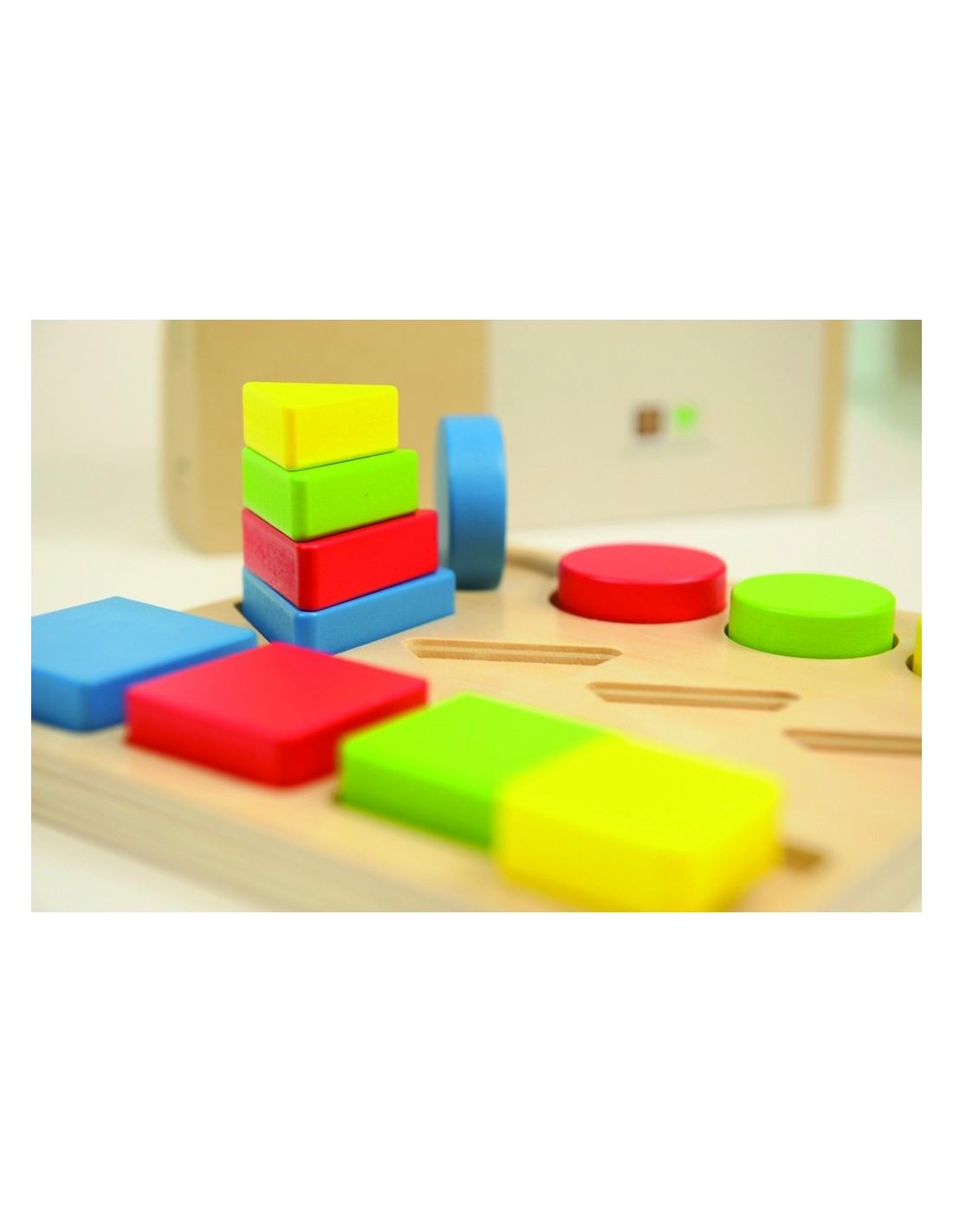 Una fantàstica joguina educativa per introduir i ensenyar conceptes múltiples als petits. Per exemple, podràs ensenyar les formes geomètriques, les mesures i el color, a través d'activitats divertides com apilar, classificar i contar. Els nens es divertiran molt col·locant les peces en el lloc apropiat de la base. Aquesta base està feta de fusta resistent i té un grossor de 1,3 cm. Les formes de fusta també es poden utilitzar com blocs de construcció i per apilar. A part d'ensenyar les formes geomètriques, els colors i les mesures, aquesta joguina també desenvolupa la coordinació ull-mà i les habilitats motores.