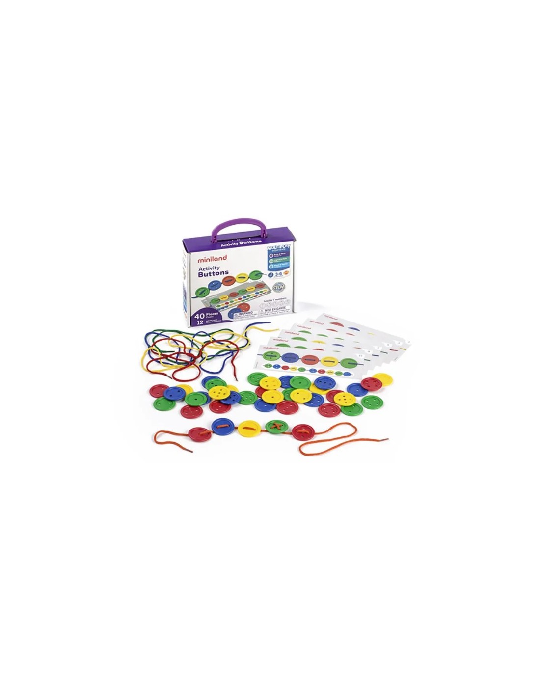 Joc d'enfilar botons de colors de 1 a 5 forats. Aquest joc estimularà la motricitat fina del nen. Inclouen la grafia del número i també la seva representació en braille. El conjunt inclou fitxes d'activitats individuals i 5 cordons d'1 metre. Joguina galardonada en els premis Independent Toy Award al Regne Unit.