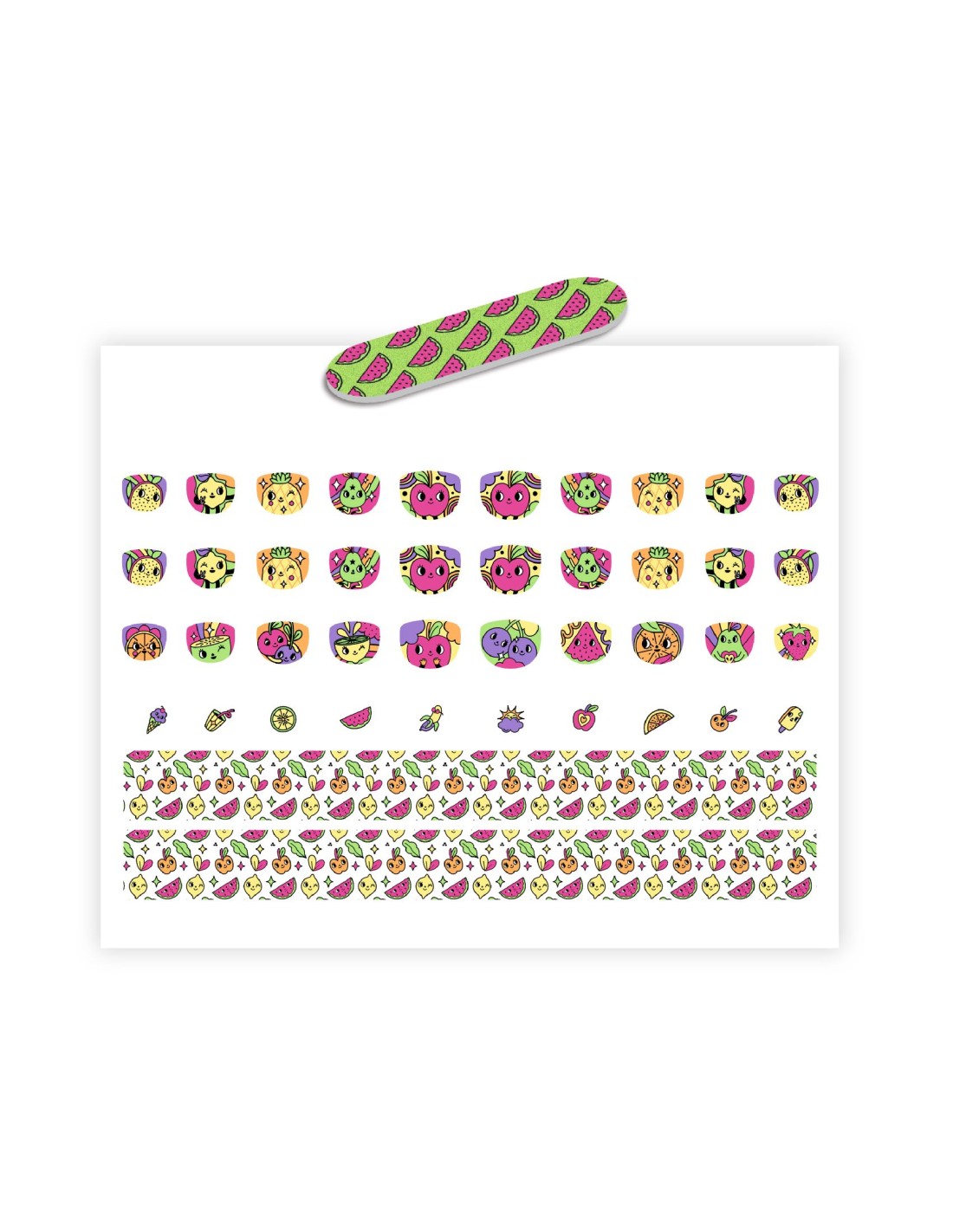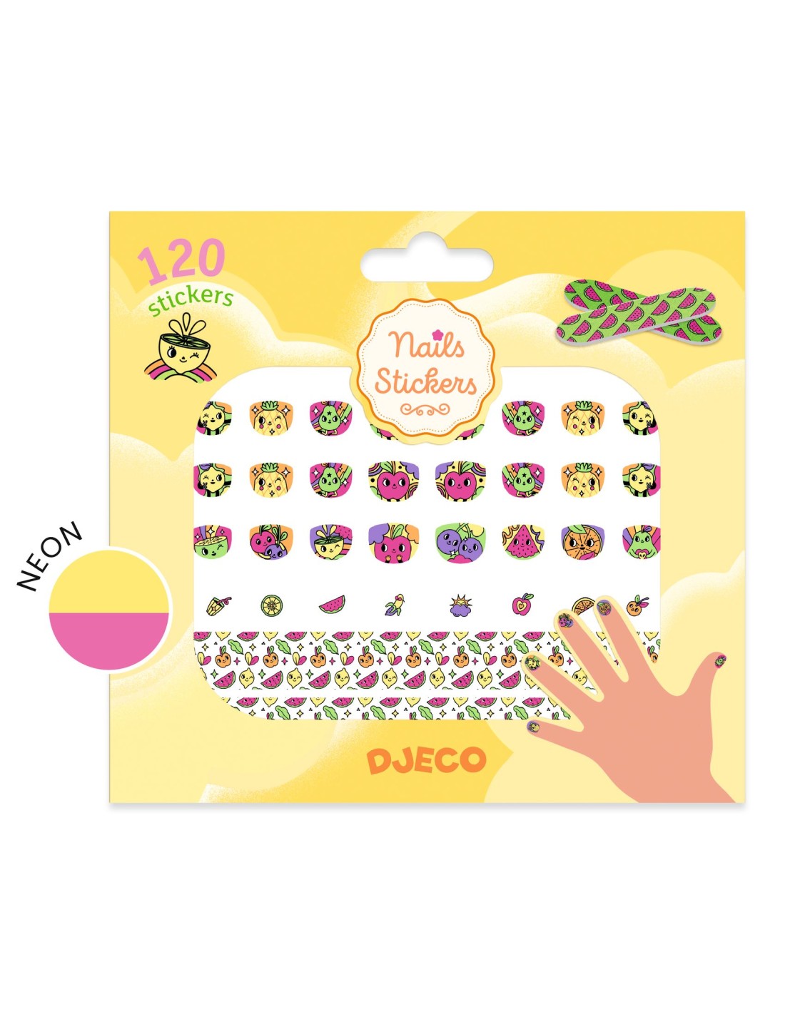 Els Adhesius per a ungles Energia de Djeco són un set d'adhesius acolorits i divertits amb dibuixos de fruites, ideals per a nens d'entre 4 i 8 anys que desitgin decorar les seves ungles de manera fàcil i segura. Aquest kit conté 120 adhesius, incloent-hi 90 adhesius per a ungles de diferents grandàries i 30 adhesius addicionals per a un toc especial. A més, inclou 6 tires decoratives que es poden retallar per a adaptar-se a la grandària de cada ungla.