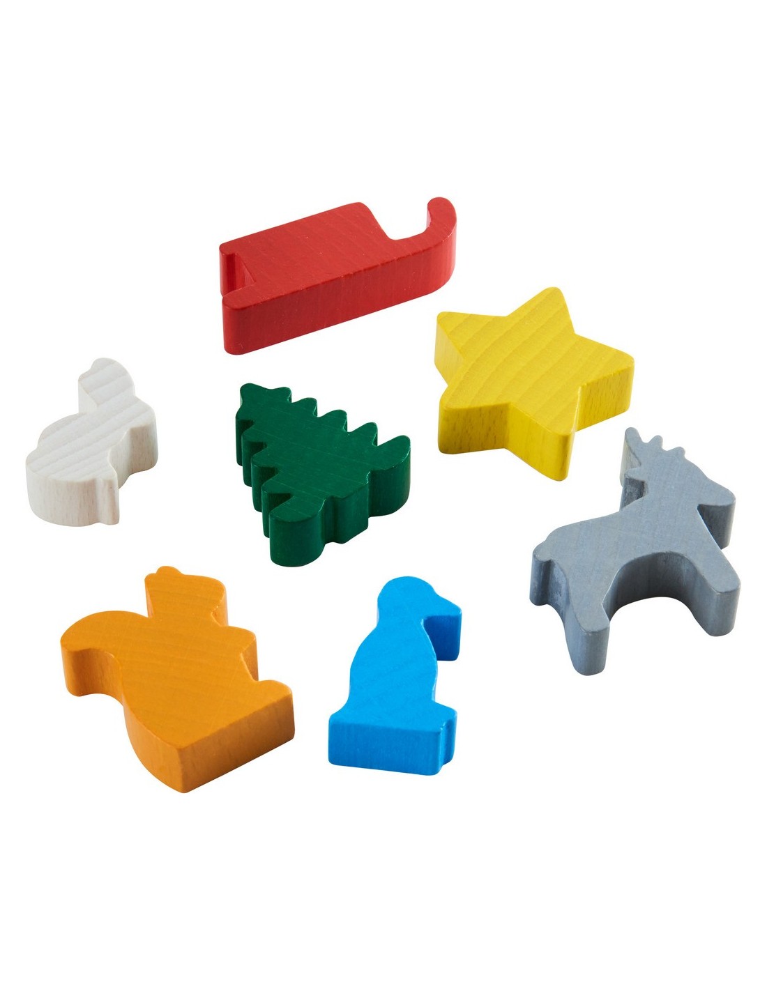 En la caixa d'Animal sobre Animal Edició Nadalenca d'Haba trobareu 1 paisatge nevat de muntanya, 4 avets, 4 trineus, 4 alcis, 4 pingüins, 4 conills de les neus,4 esquirols, 4 estrelles, 1 dau i 1 instruccions del joc.