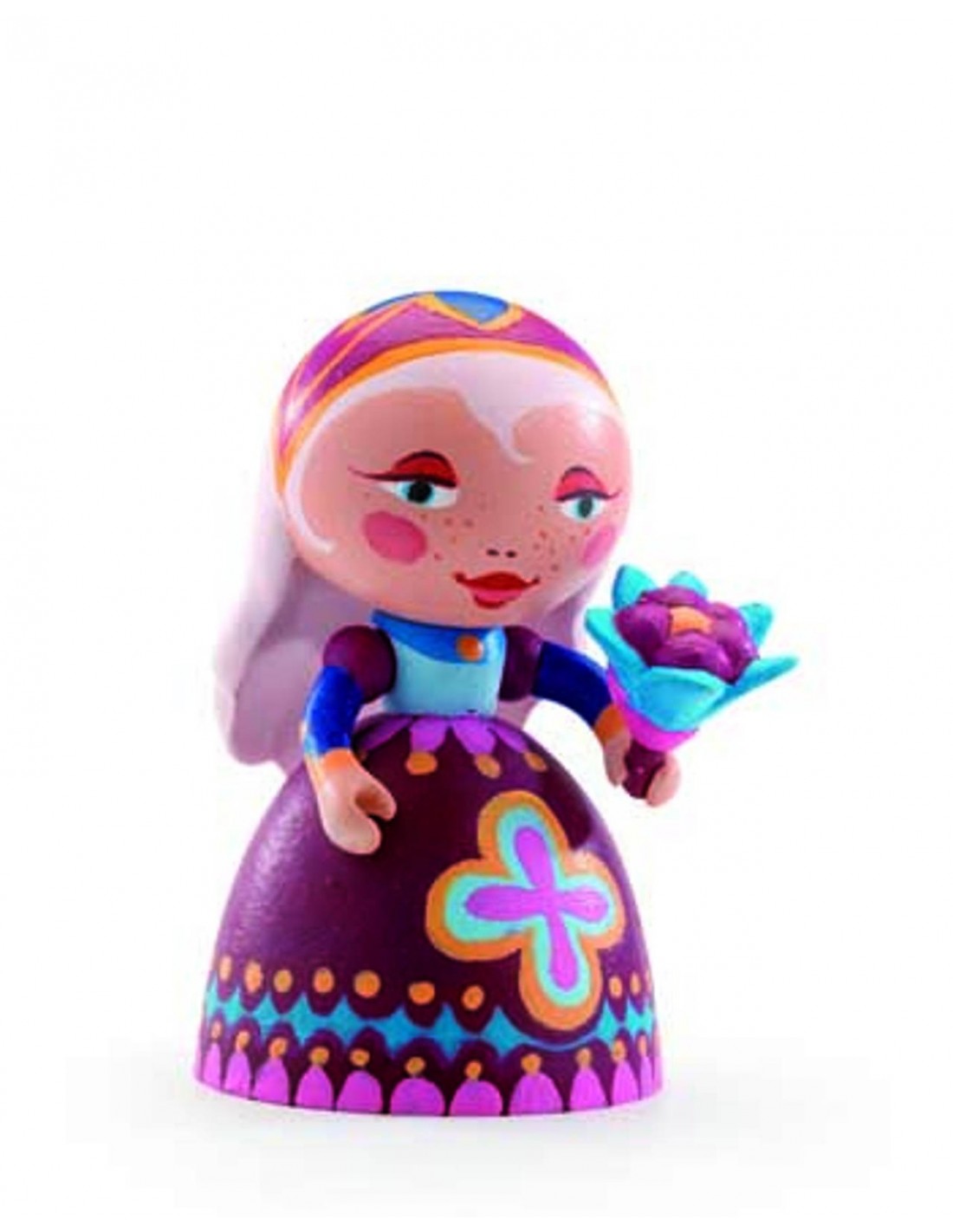 Preciosa princesa de la marca Djeco. Aquesta princesa porta un vestit molt bonic i a la mà té un ram de flors. Se li pots moure el cap i els braços gràcies a que és articulada i, gràcies als seus vius colors, podràs usar-la per a decorar.