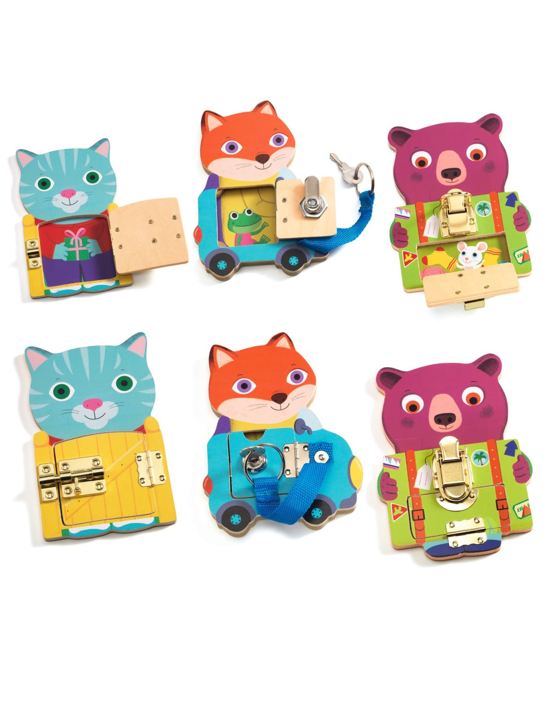 Locktou és un joc de fusta divertit i original perfecte per a estimular les habilitats motores dels nens que consta de tres personatges de fusta: un gatet, una guineu i un osset. Cadascun d'ells conté un tresor que descobrireu a poc a poc mentre obriu els diferents pestells i panys.