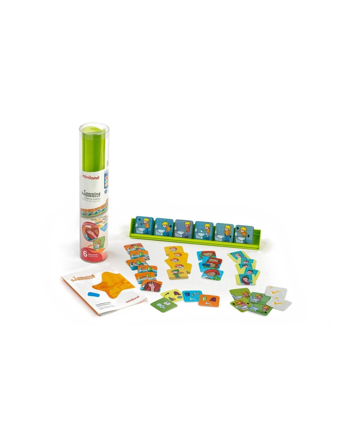 Les targetes de Seqüències d'aprenentatge: Hàbits d'higiene de Miniland serviran per a ordenar-les fent històries i familiaritzar-se amb conceptes de temps, a més d'higiene. Podeu ordenar les seqüències i parlar d'imatges en narrar una història coherent mentre cregueu una rutina d'higiene que el nen podrà seguir fàcilment i motivat, en companyia d'un adult del qual prendre exemple.