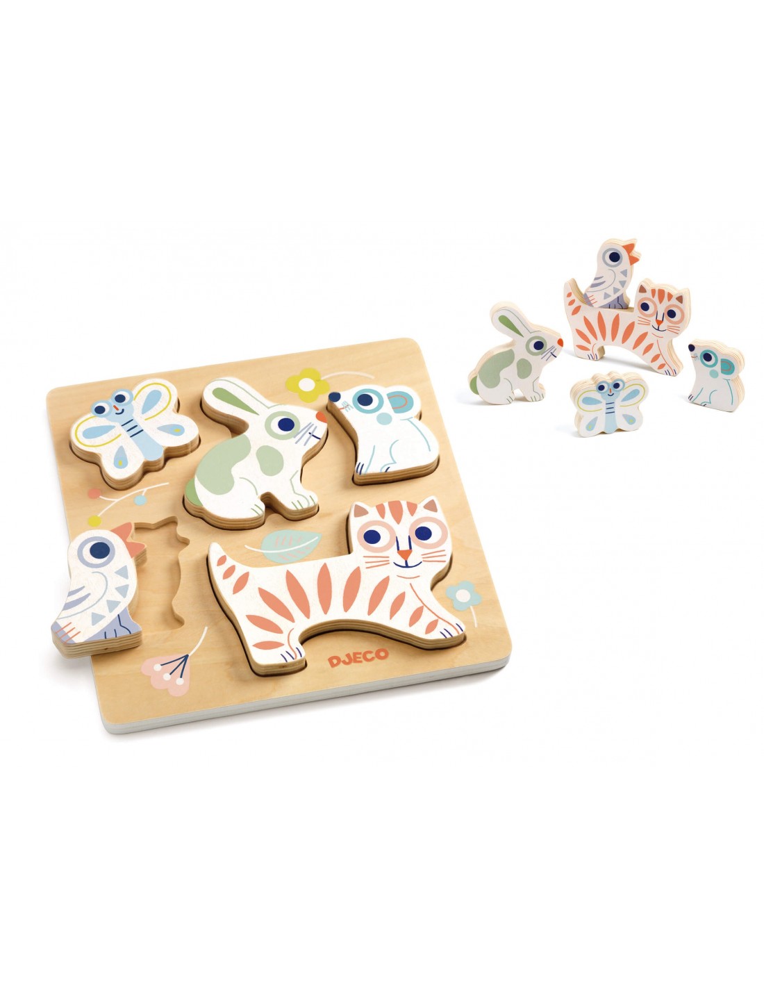 Et presentem Baby Animali de Djeco, un joc d'encaixar d'animals amb 5 animals adorables: el gat, l'ocell, el conill, la papallona i el ratolí.