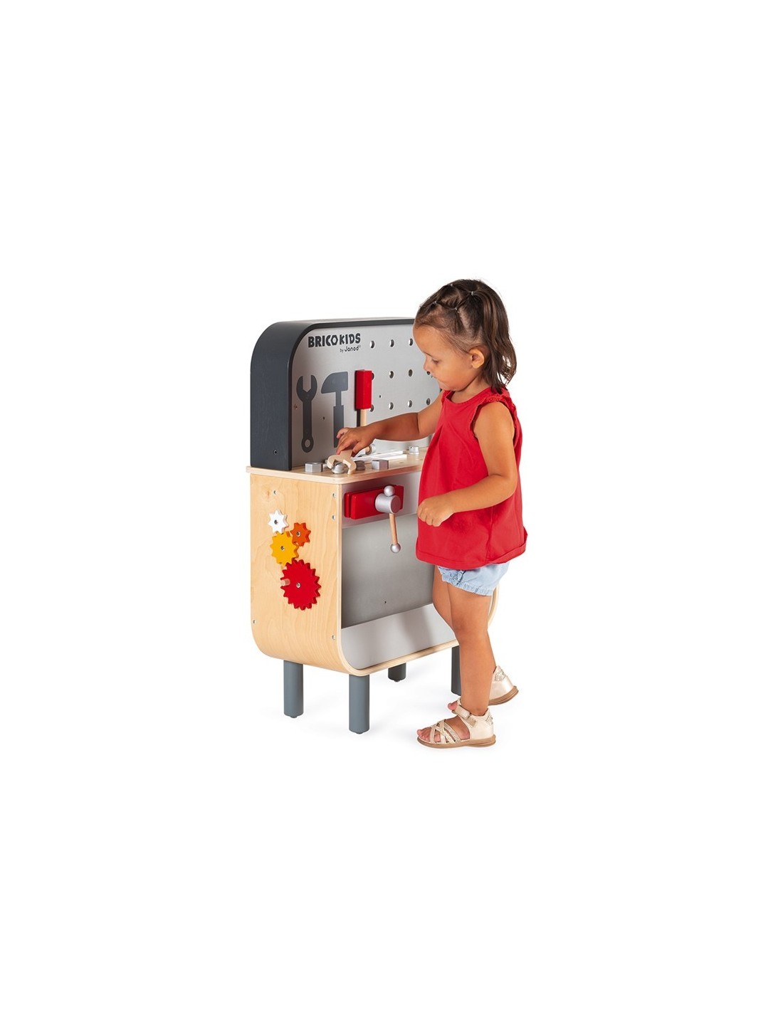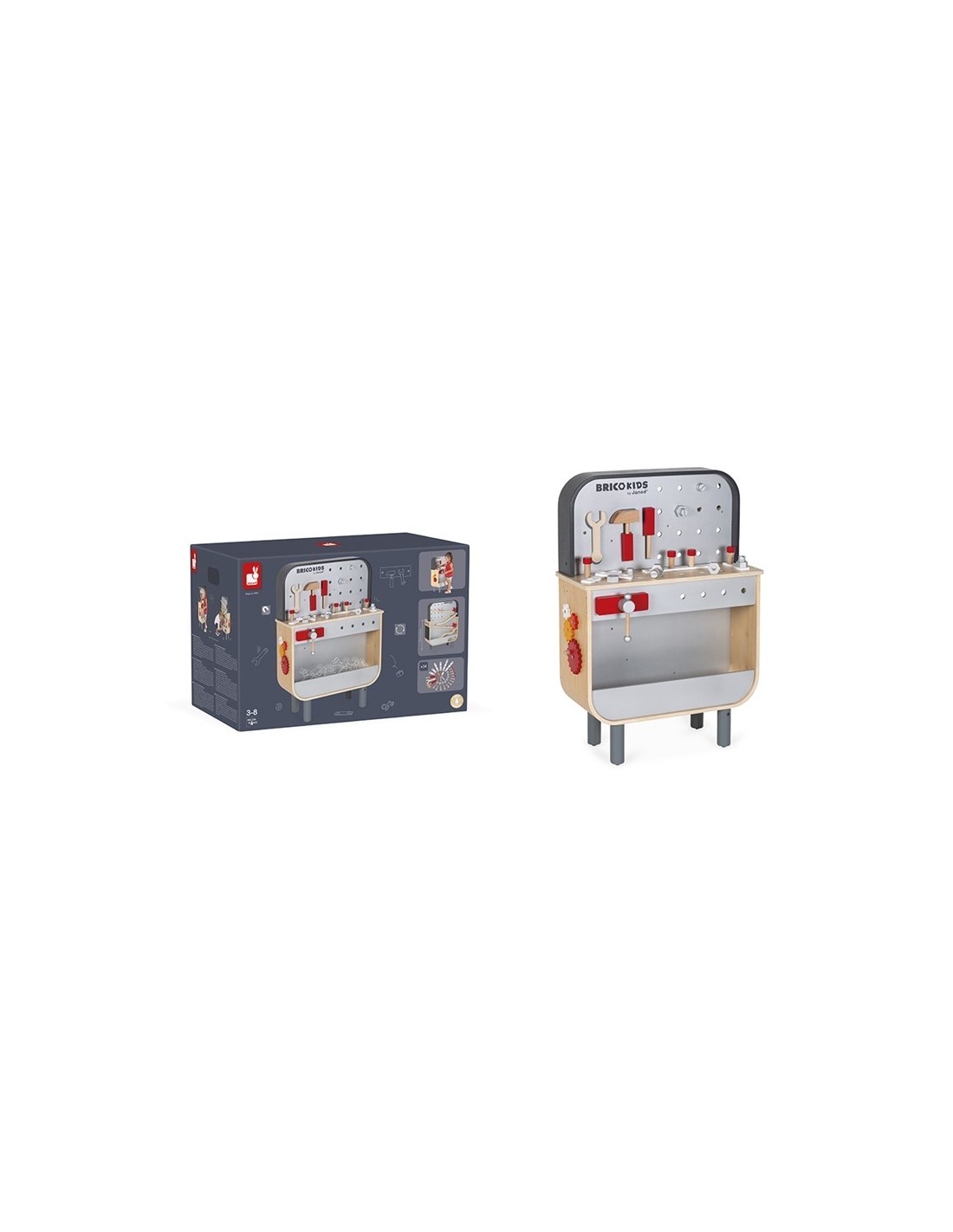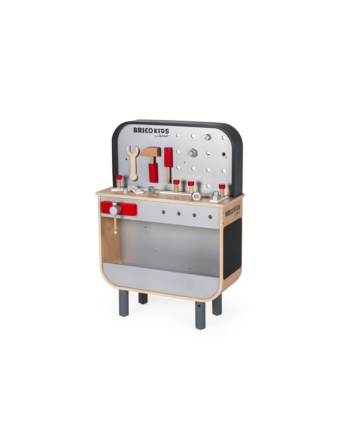 Janod ens presenta aquest banc de treball reversible, ideal per a nens de 3 a 8 anys. Es tracta d'una joguina feta de fusta corbada, és molt original i té dos costats: en la part davantera, té un complet banc de treball magnètic amb un enginyós sistema d'eines magnètiques perquè el material sempre estigui ben ordenat en el seu lloc i molts accessoris per a inventar-se objectes que muntar i desmuntar sense parar. Inclou tres eines magnètiques, 29 accessoris (rosques, caragols, claus de fusta, plaques, guixos), un caragol de mordassa, un sistema d'engranatges i una pissarra (en el lateral) per a escriure amb guix.