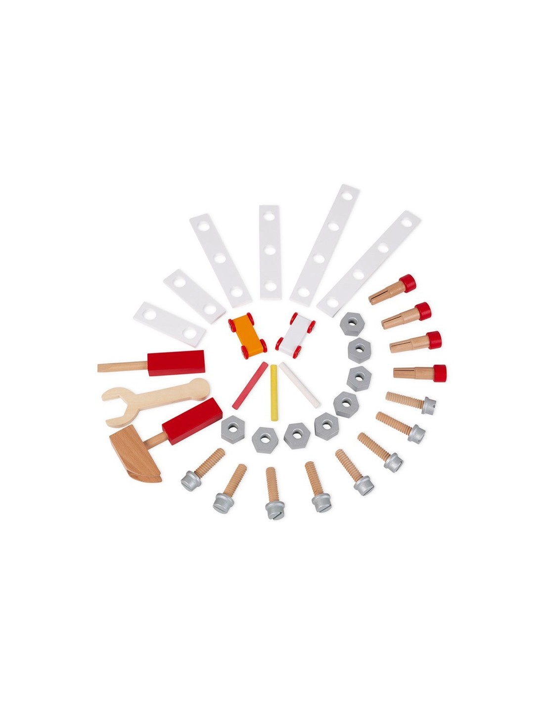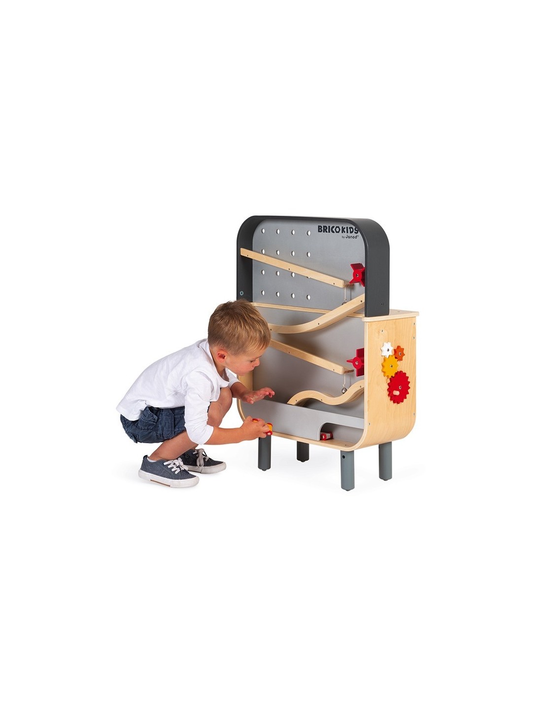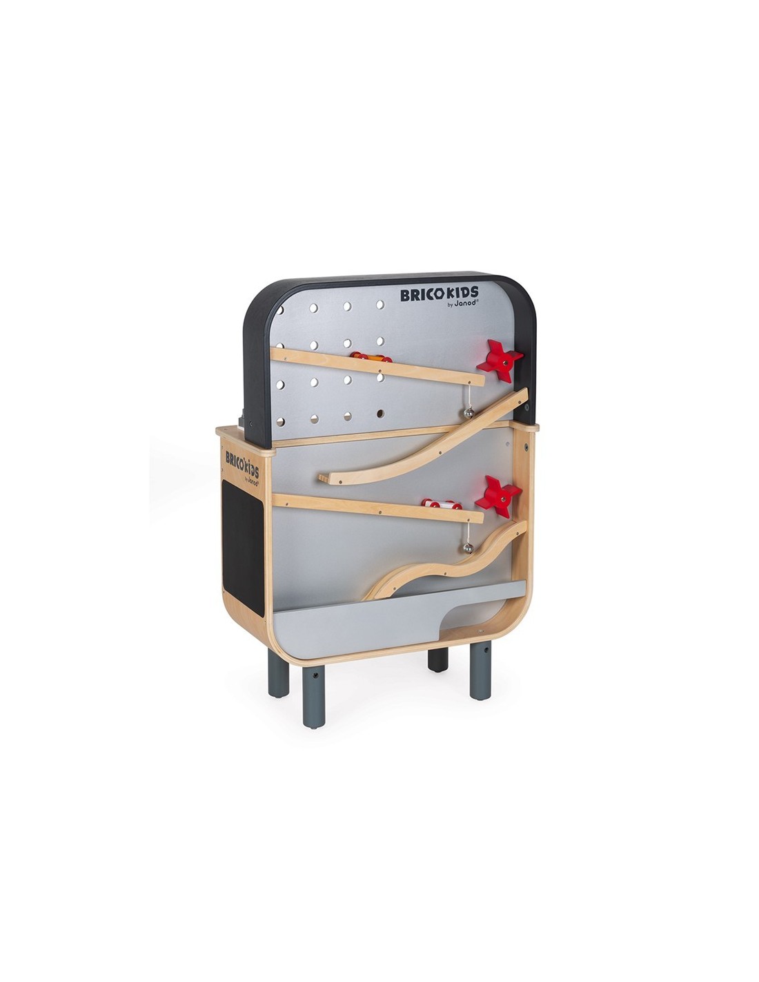 Janod ens presenta aquest banc de treball reversible, ideal per a nens de 3 a 8 anys. Es tracta d'una joguina feta de fusta corbada, és molt original i té dos costats: en la part davantera, té un complet banc de treball magnètic amb un enginyós sistema d'eines magnètiques perquè el material sempre estigui ben ordenat en el seu lloc i molts accessoris per a inventar-se objectes que muntar i desmuntar sense parar. Inclou tres eines magnètiques, 29 accessoris (rosques, caragols, claus de fusta, plaques, guixos), un caragol de mordassa, un sistema d'engranatges i una pissarra (en el lateral) per a escriure amb guix.