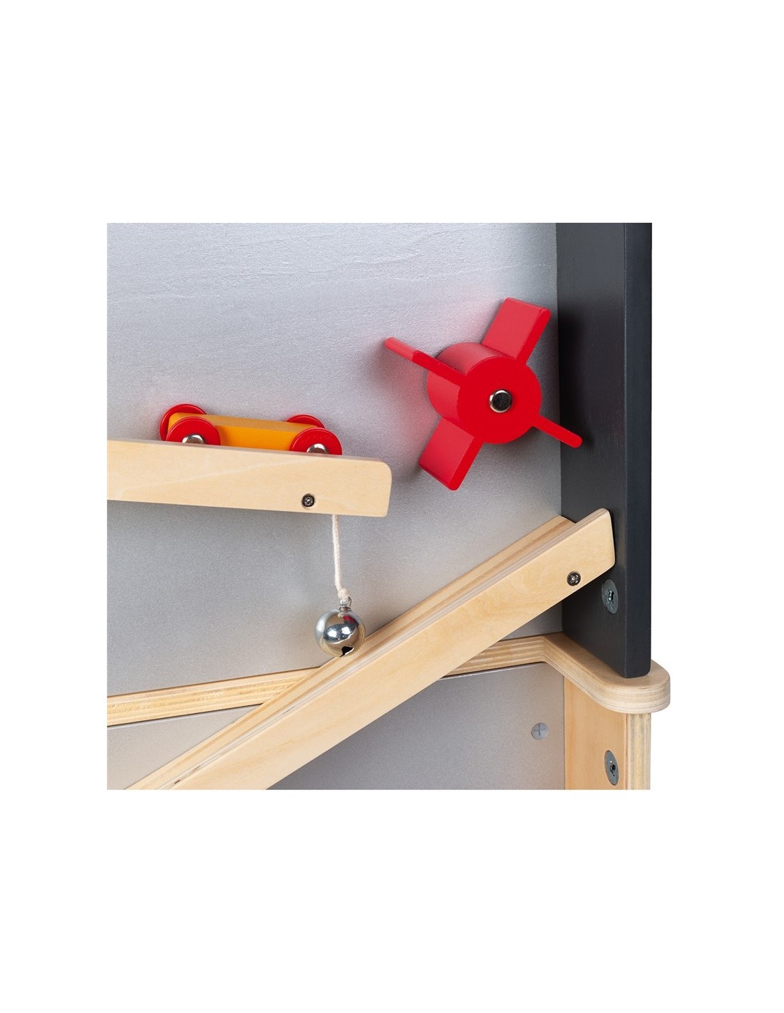 En la part de darrere, hi ha quatre pistes de descens amb dos cotxes que es donen el relleu per a baixar el pendent fent girar les ruedecillas i sonar els cascavells. En total s'inclouen 34 accessoris en aquest banc de treball de disseny de fusta.