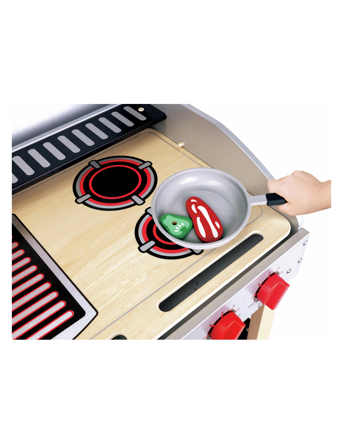 Aquest complet set inclou 21 peces d'aliments i accessoris que permeten preparar deliciosos plats imaginaris, desenvolupar habilitats motores fines i potenciar la coordinació ull-mà. La disposició dels elements, amb graelles, taules i utensilis, convida a organitzar la cuina, experimentar amb combinacions d'ingredients i planificar menjars, fomentant la creativitat i l'atenció al detall.