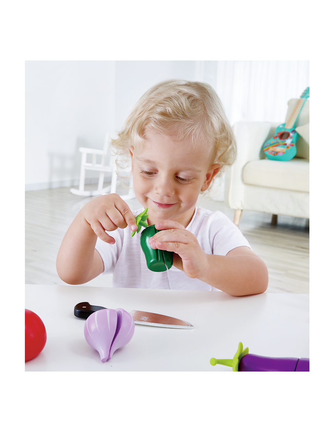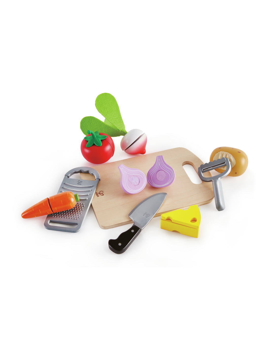 Aquest lot inclou 10 peces essencials per a cuinar: 6 aliments realistes, 1 taula de fusta, 1 ganivet i 1 pelador. Amb ingredients separables i utensilis diferents, aquest kit ofereix una experiència de joc més realista, que permet als nens pelar i tallar les verdures o ratllar el formatge com el farien en una cuina de veritat.