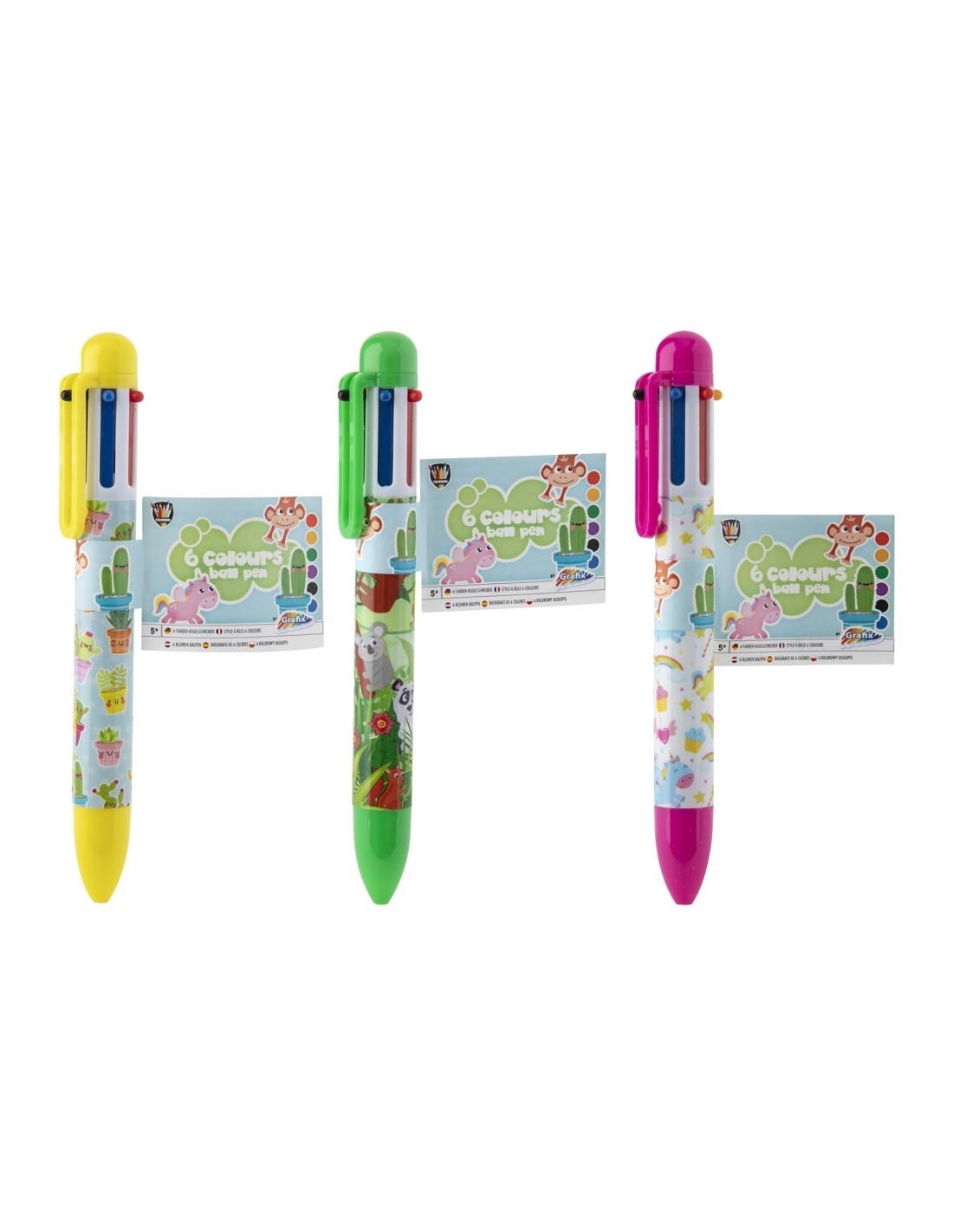 Llestos per a tornar a l'escola? Et portem aquest bolígraf de 6 colors, llest perquè el facis servir per a escriure en la teva agenda, fer els deures, deixar-los notes als teus amics i escriure'ls cartes als teus familiars. Els 6 colors són blau, vermell, verd, negre, groc i lila.