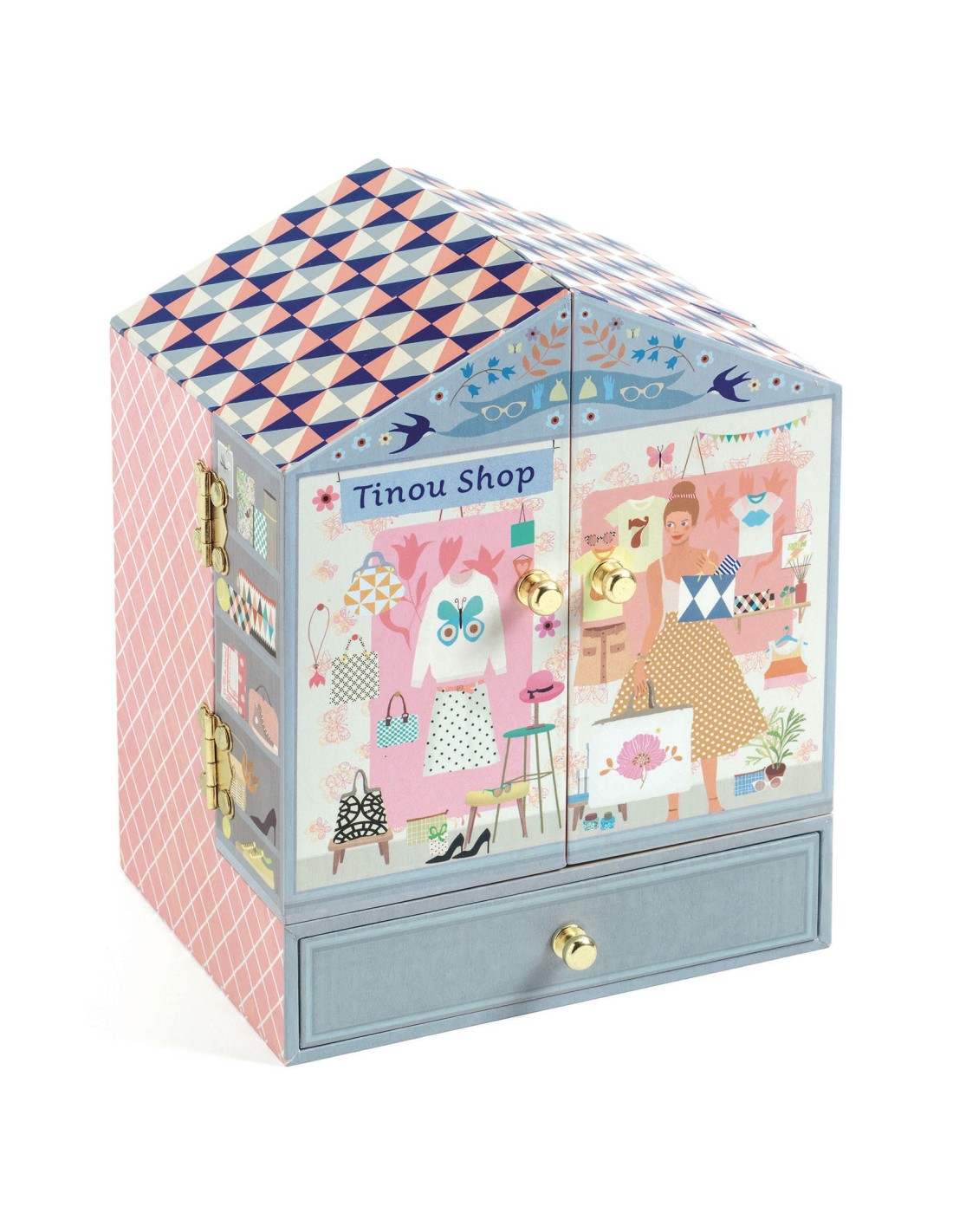 Et presentem la preciosa caixa de música de Djeco “La botiga de Tinou”, una meravellosa caixa de música inspirada en una botiga amb un petit calaix a cada costat i un calaix més gran en el front i un en la part posterior. Simplement haureu de donar corda a la clau, obrir la caixa i observar com gira la La botiga de Tinou de manera relaxant i gràcil al ritme de “La flauta màgica”, cançó que sonarà per 2,5 minuts.