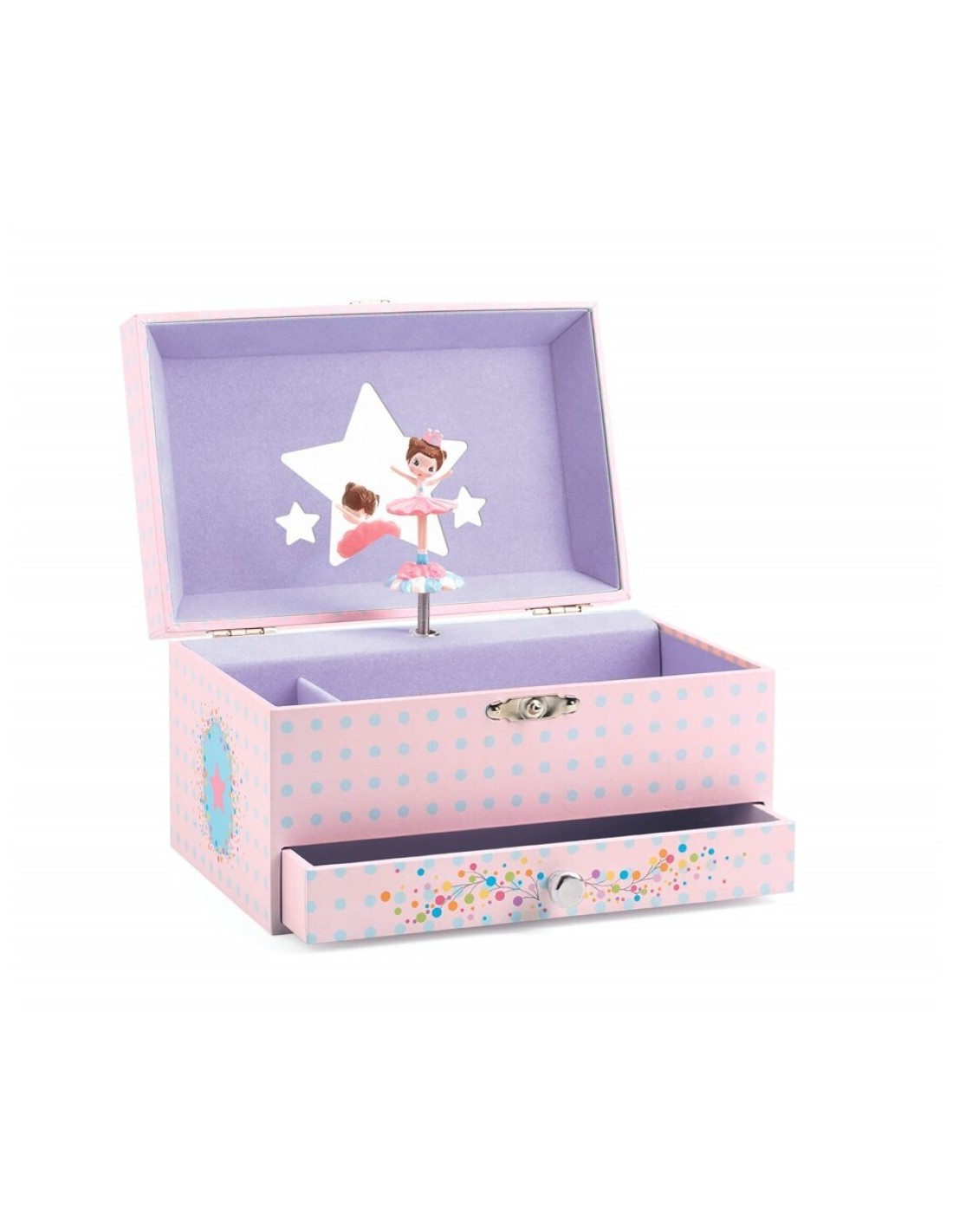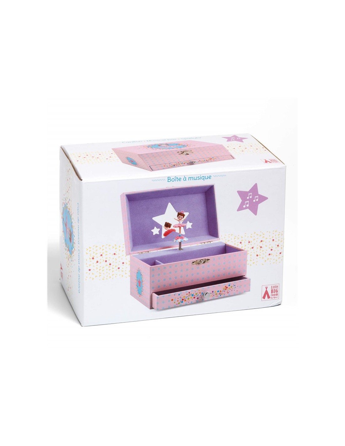 La Caixa de música Melodia de la Ballarina de la col·lecció Little Big Room de Djeco és una joguina musical i joier que combina art, música i funcionalitat en un disseny encantador pensat per a nens a partir de 4 anys. Aquest delicat objecte convida els petits a descobrir la màgia de la música mentre guarden els seus tresors més preuats dins. En girar la manovella i obrir la caixa, la ballarina finament esculpida comença a girar al so de la melodia d'“Invitació a la Dansa” de Carl Maria von Weber, reflectint-se en un mirall amb la silueta d'una estrella, creant un efecte hipnòtic i elegant que fascina a grans i petits.