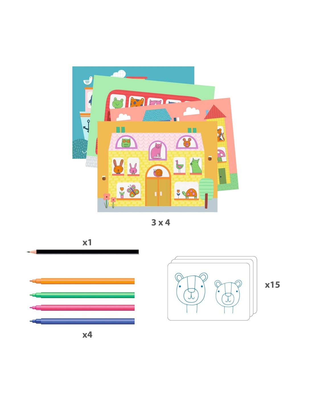 Contingut: 12 imatges amb paper de calcar (4 imatges de 3 cadascuna), 15 targetes (10 x 7 cm) amb motius per a calcar, 1 llapis amb goma per a esborrar, 4 retoladors (colors: groc, rosa, verd, blau), instruccions.