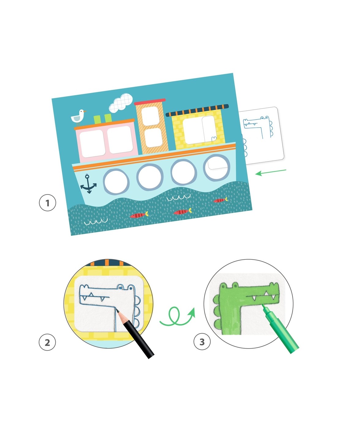 Aquest conjunt creatiu Calcar és un art de Djeco conté 12 imatges amb paper de calcar, a través dels quals els nens traçaran els motius en les targetes amb un llapis i els omplirà de color.