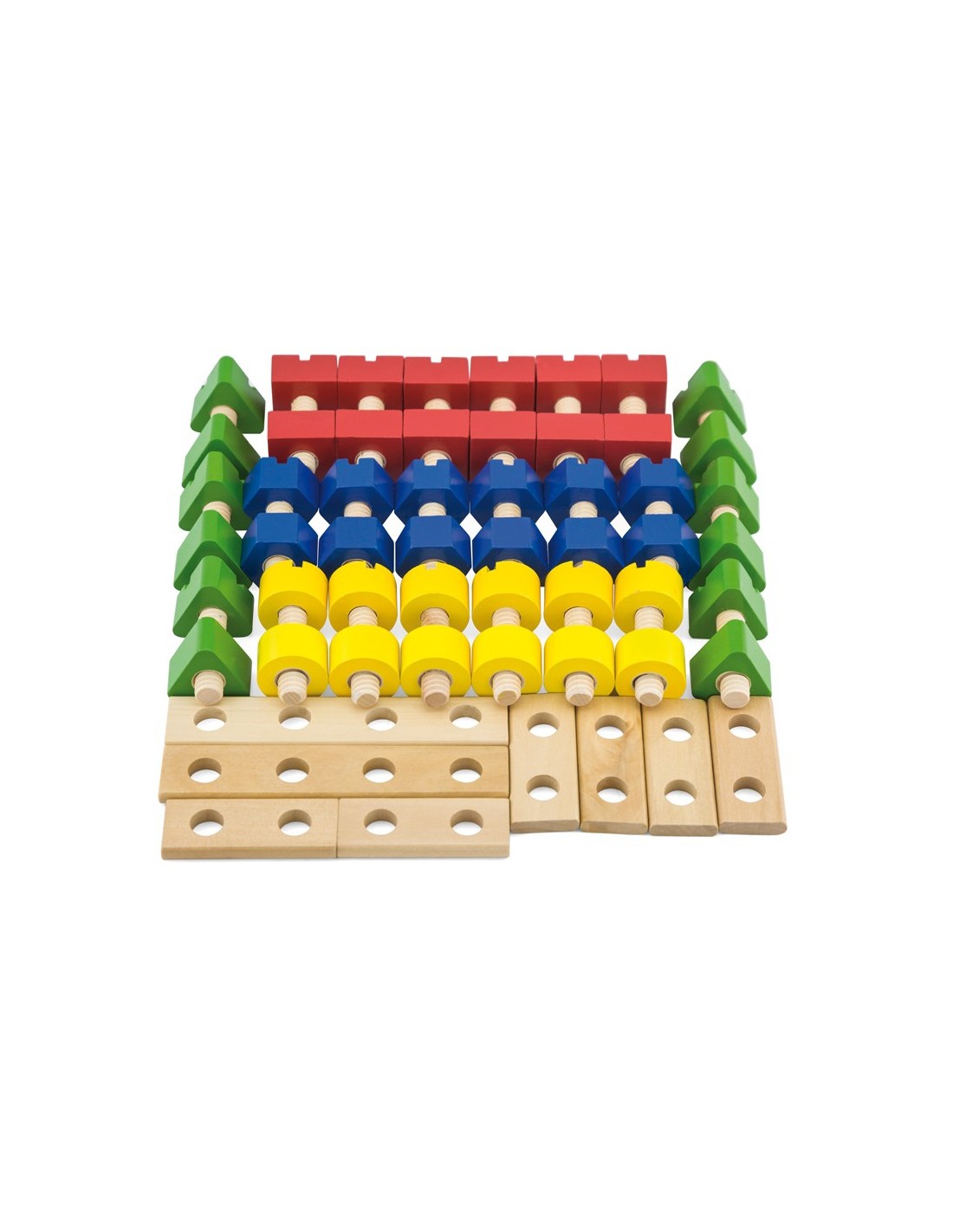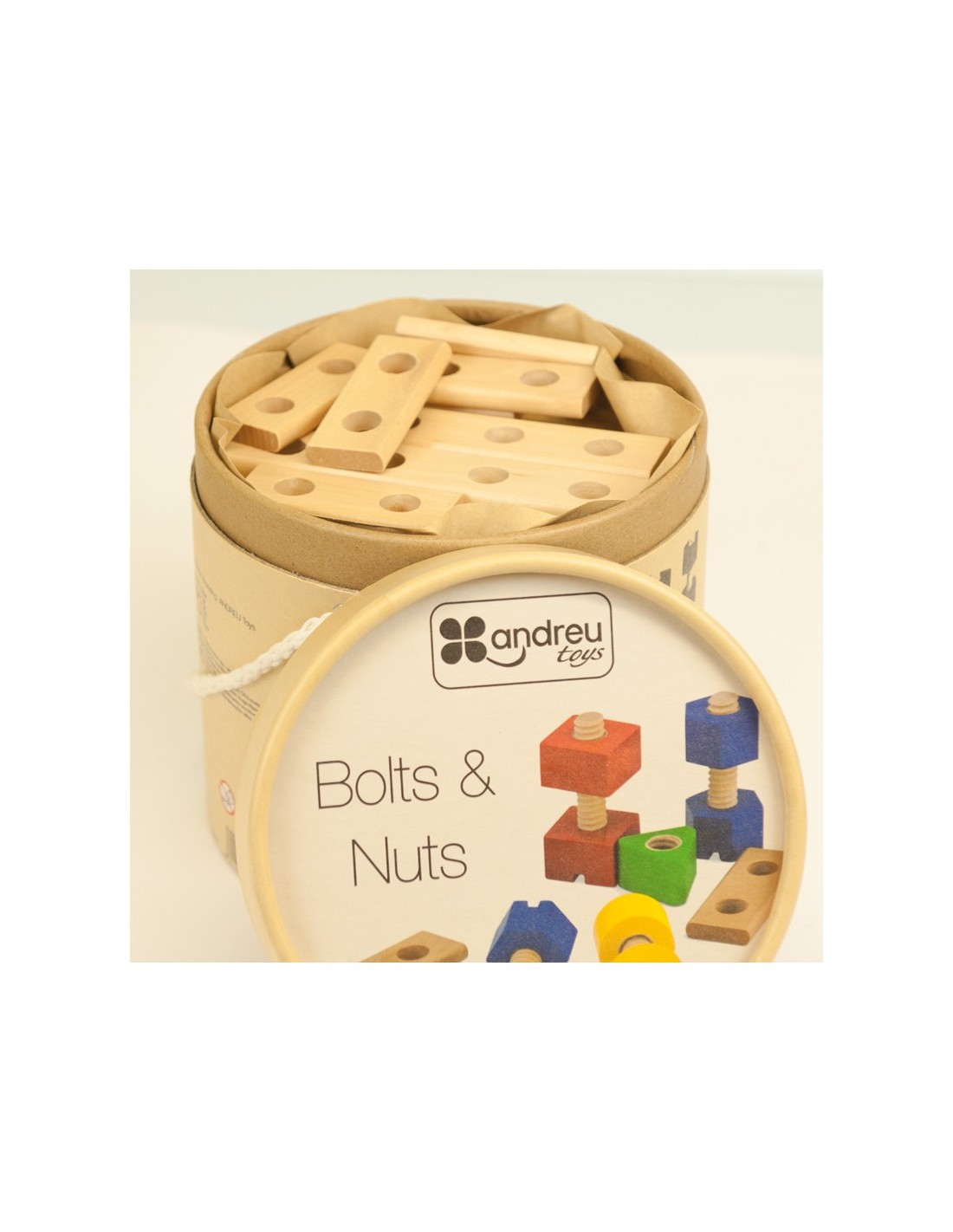 Aquest pack de 56 caragols i rosques de fusta d'Andreu Toys està recomanat a partir dels 3 anys i conté 8 tables perforades de construcció, i 24 rosques i cargols de color vermell, verd groc i blau. A més, les peces de fusta massissa estan pintades amb pintura a base d'aigua, no tòxiques, per la qual cosa no suposen un perill.