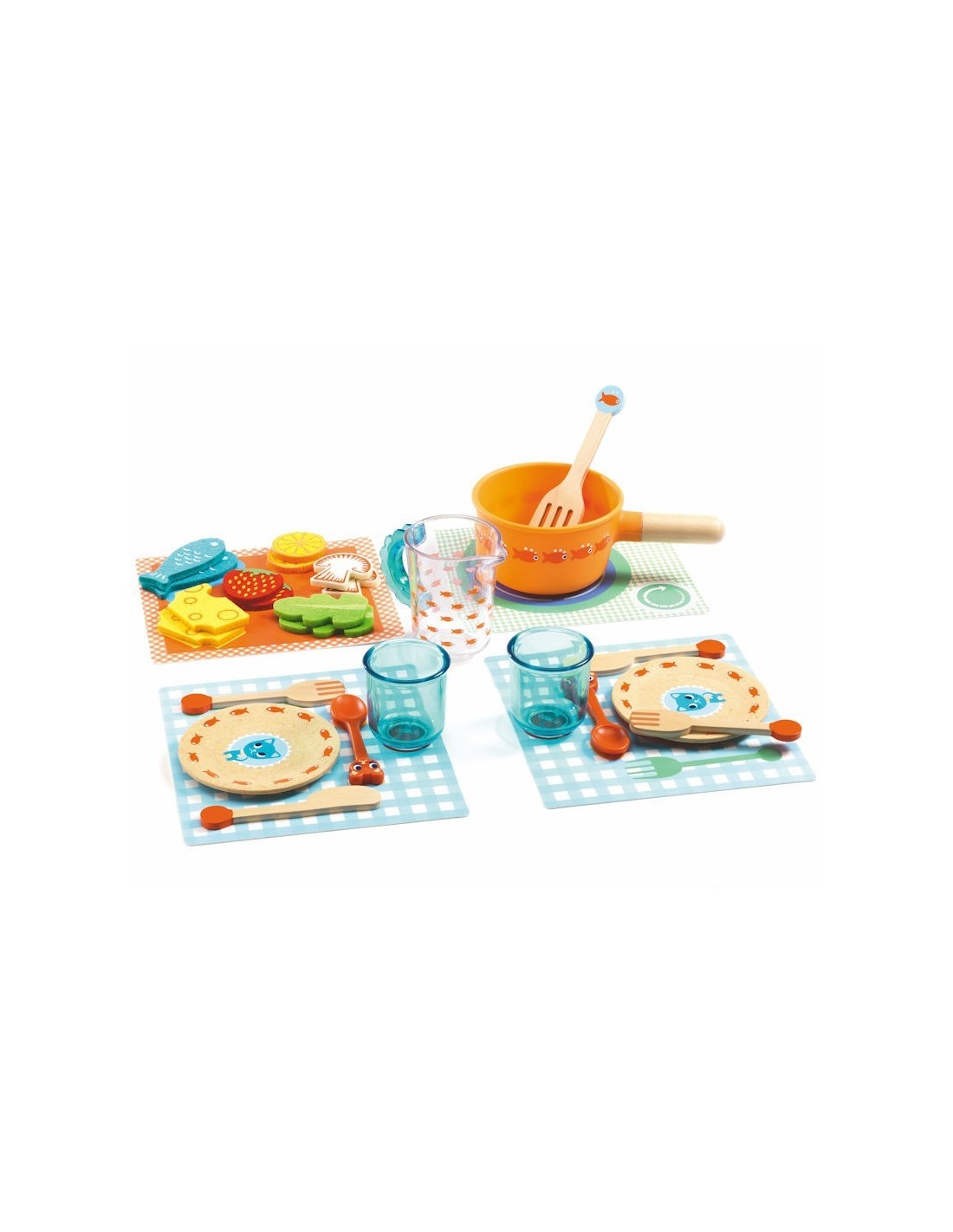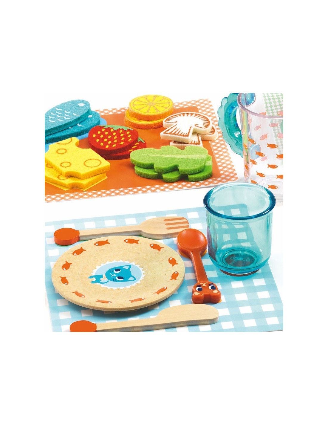 Aquest set de coberteria tan bufó de la marca Djeco és complet i ve dins d'una caixa molt fàcil de transportar. Amb 29 peces per a delectar al teu petit amb les il·lustracions de bufons gatets que la decoren. Trobareu 2 estovalles individuals, 2 jocs de taula per a col·locar aliments, 1 gerra, 2 ganivets i 2 forquetes, 1 espàtula, 2 gots, 2 plats , 2 cullaretes, 1 casserola i 12 aliments: 2 fulles d'amanida, 2 rodanxes de xampinyons, 2 rodanxes de Gruyère, 2 peixos, 2 rodanxes de taronja, 2 rodanxes de maduixa.