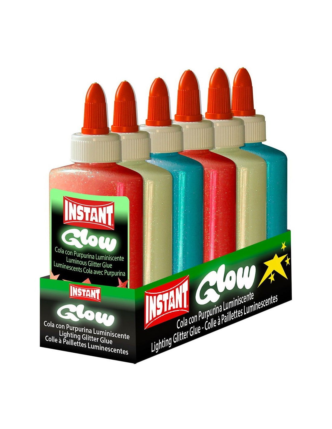 Cola especial que brilla en la foscor i té purpurina luminiscent. Serveix com a cola tradicional per enganxar paper i cartró i també és perfecta per fer Slime que brilla en la foscor.