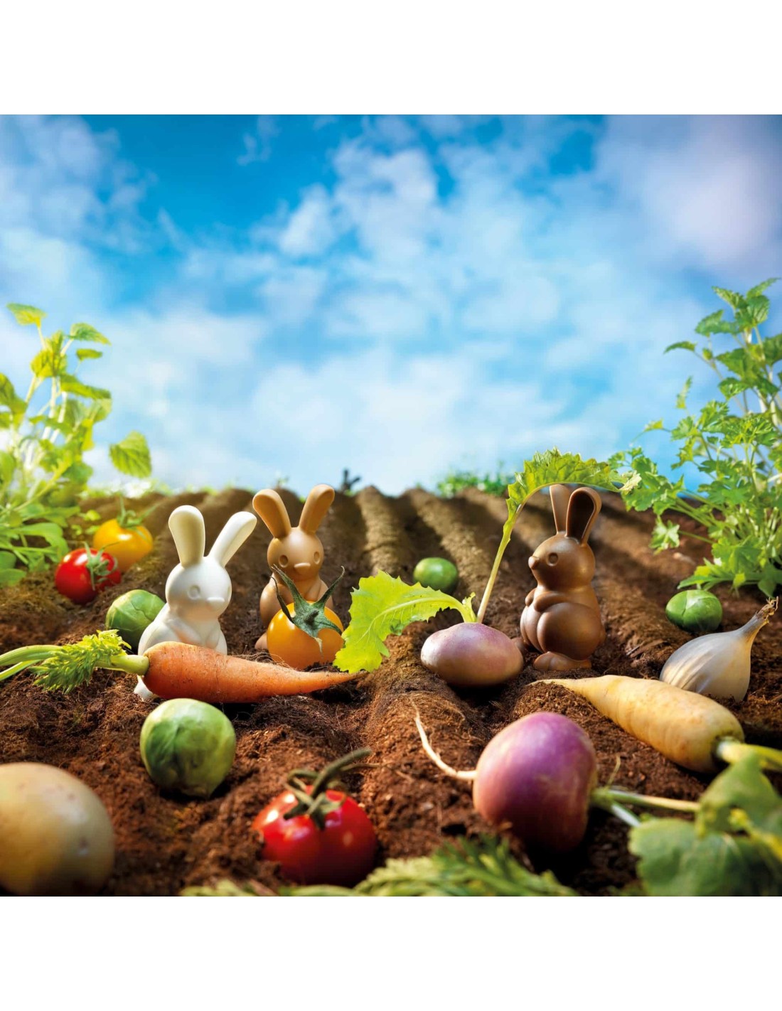 Els conills famolencs estan saltant per l'horta, poden veure hortalisses si miren sota les fulles. Recordes quina hortalissa hi havia plantada aquí? Si no, els animals que viuen sota terra te'ls treuran! Seràs el primer a recol·lectar quatre hortalisses diferents?
