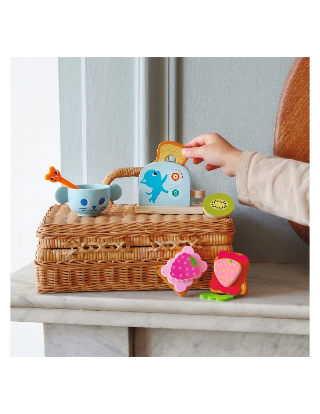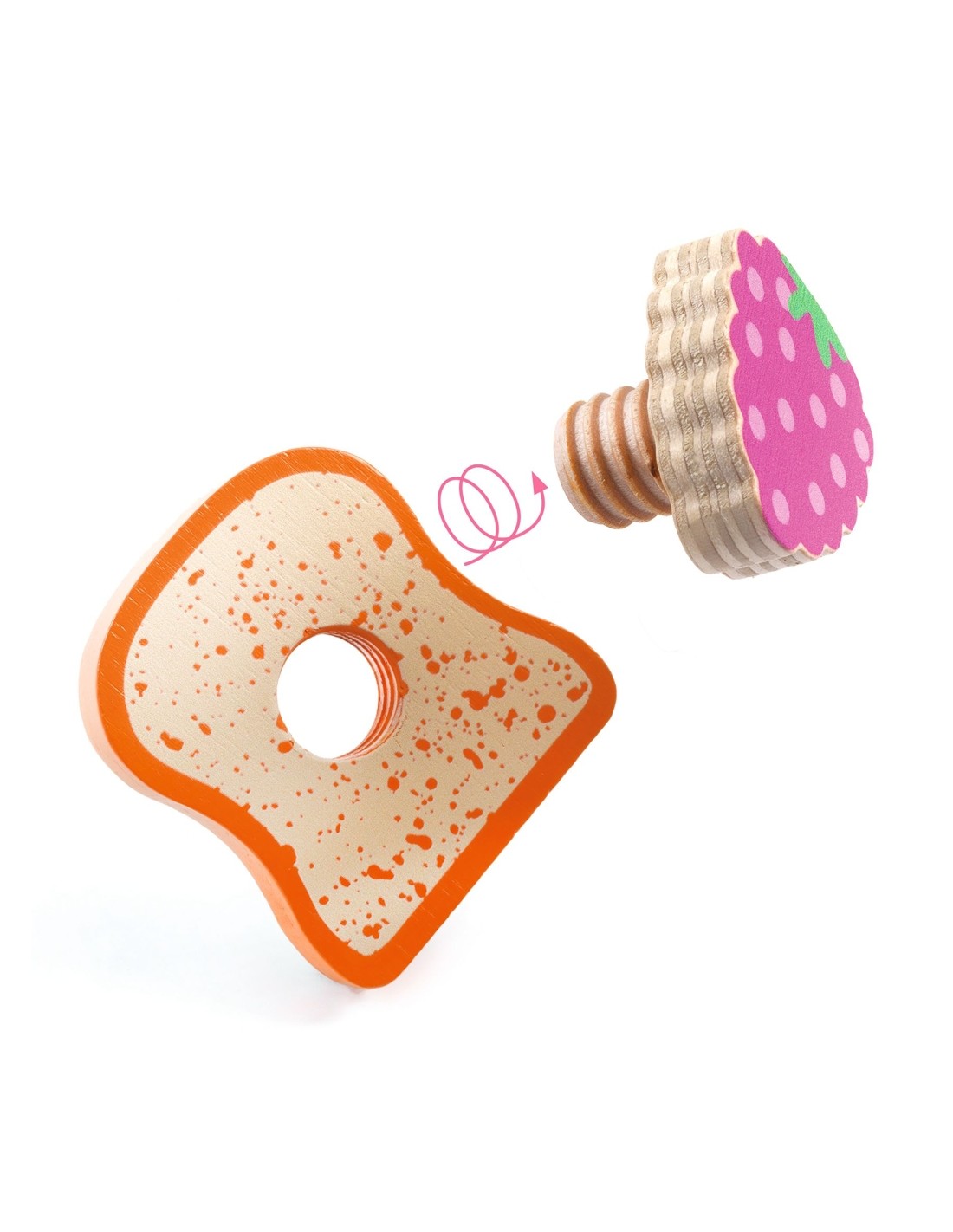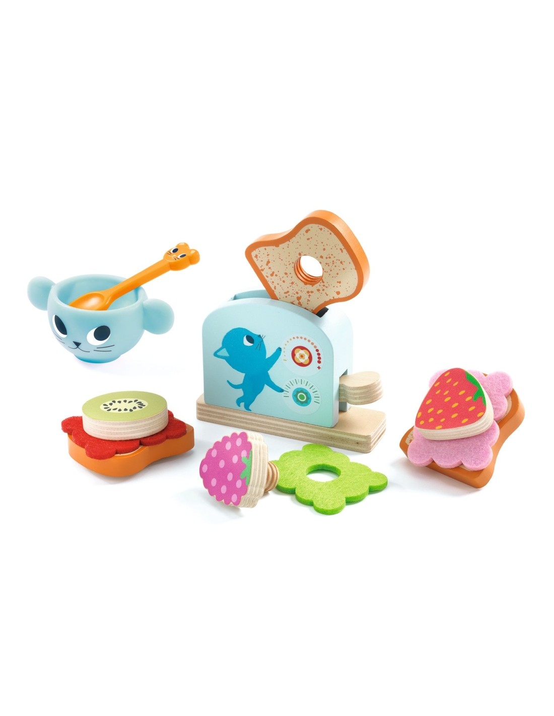 El conjunt inclou 3 llesques de pa torrat de fusta, 3 peces de fusta que es cargolen i descargolen, 3 melmelades de feltre, 1 torradora, 1 tassa i 1 cullera petita. Totes les peces es poden guardar i transportar fàcilment a la petita banyera, brindant comoditat i organització al joc imaginatiu dels xefs.