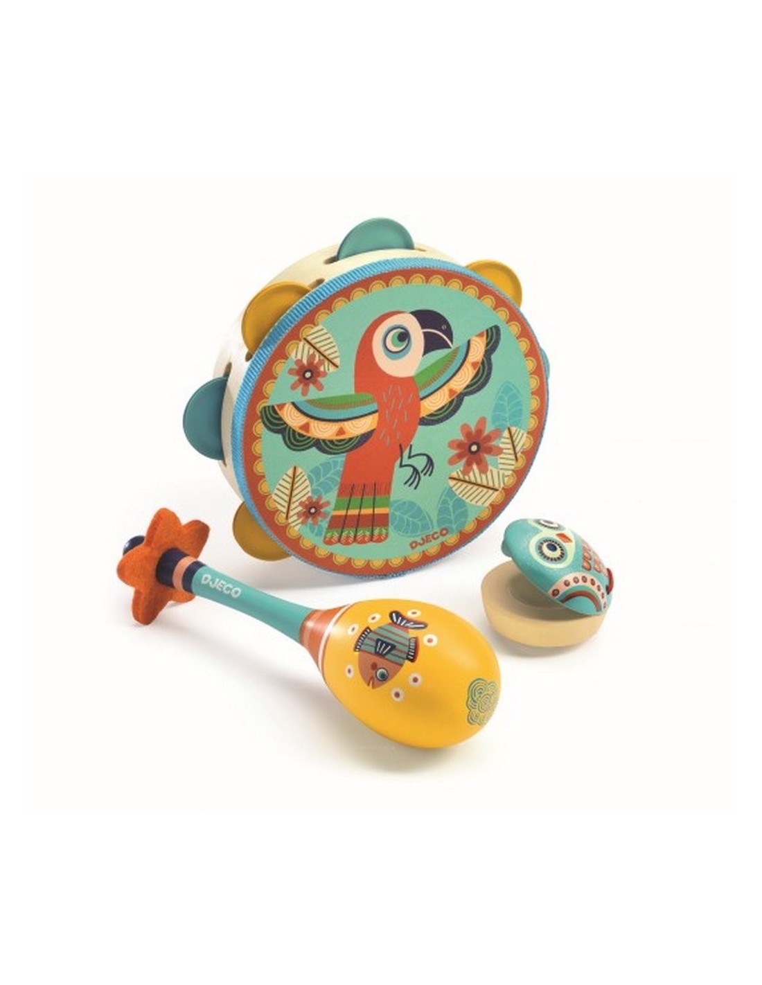 Djeco ens porta aquest preciós conjunt d'instruments que inclou una pandereta, maraca i castanyola per a despertar en els nens un interès creixent per la música. Fabricat en fusta d'alta qualitat i pintat amb colors cridaners i il·lustracions d'ocells, està concebut per a estimular les destreses auditives dels nens i les seves capacitats creatives.