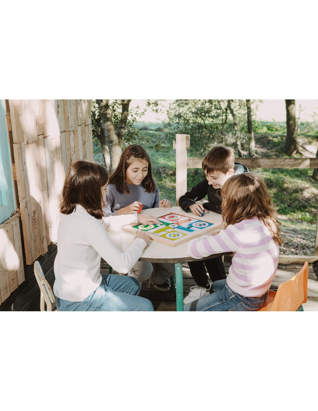 El tauler mesura 40 cm i està fabricat amb fusta de pi natural sense tractar, la qual cosa li aporta un aspecte rústic, resistent i molt durador. El seu marc de fusta realça la qualitat artesanal del conjunt i el converteix en un joc que no sols entreté, sinó que també llueix elegant en qualsevol llar o aula. Cada partida es converteix en una experiència pròxima, senzilla i entranyable, com les de tota la vida.