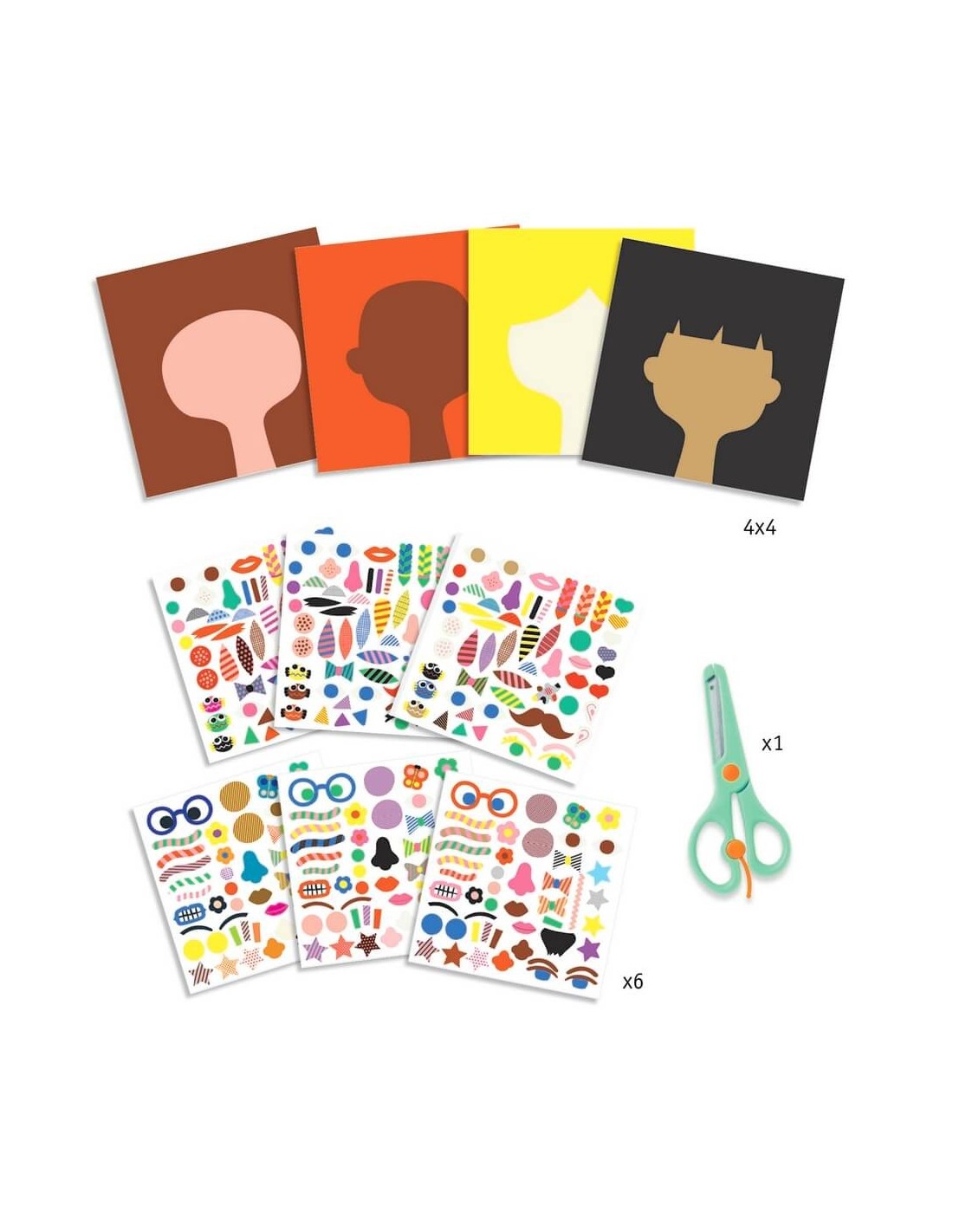 La caixa conté 16 targetes de 4 dibuixos diferents, 6 làmines plenes d'adhesius i unes tisores