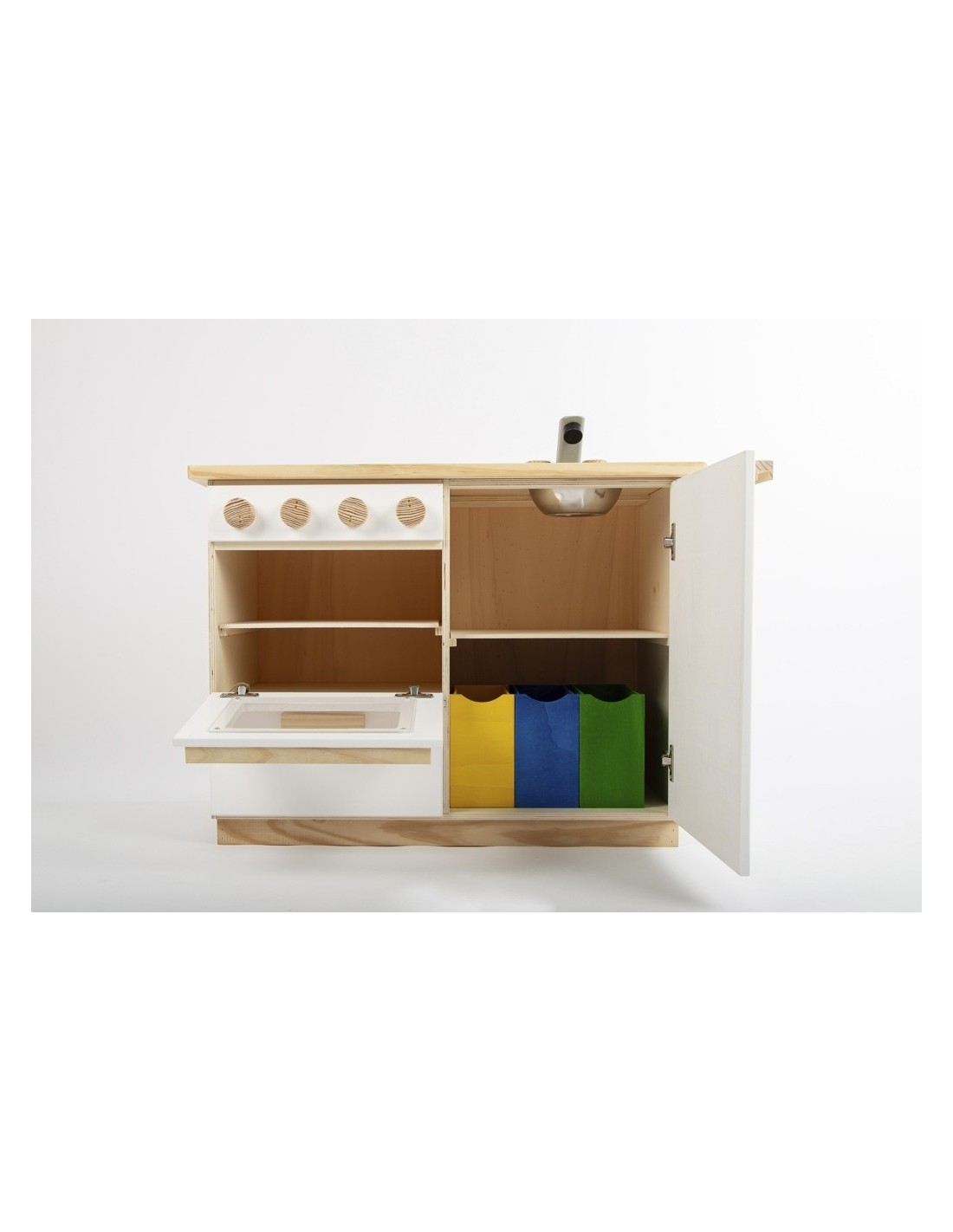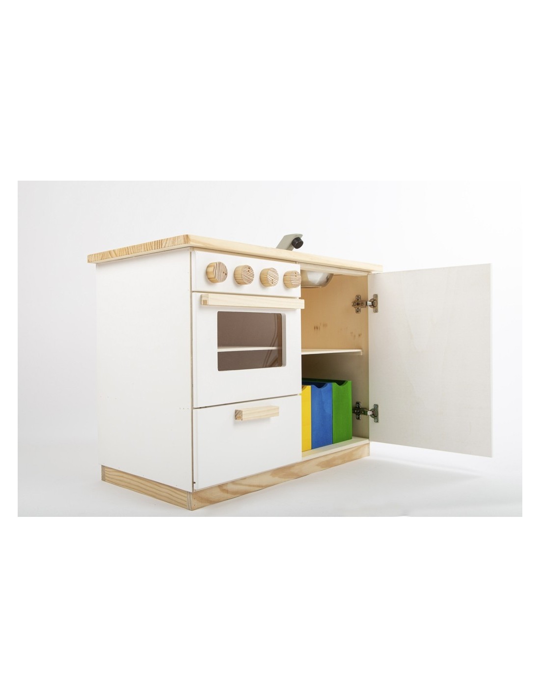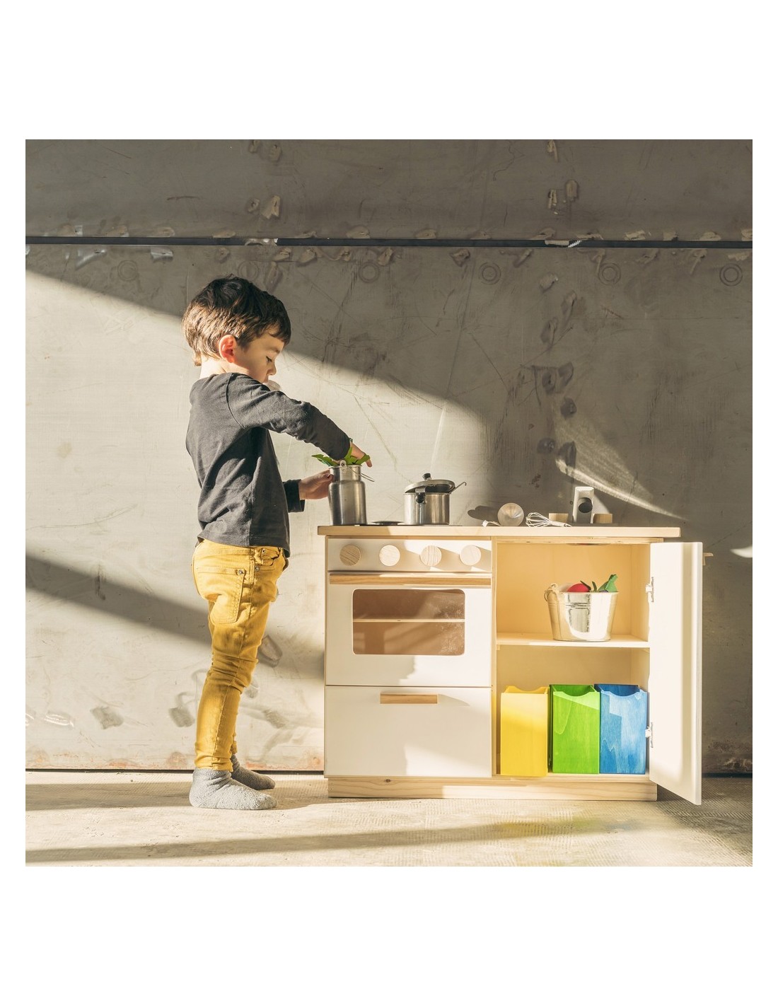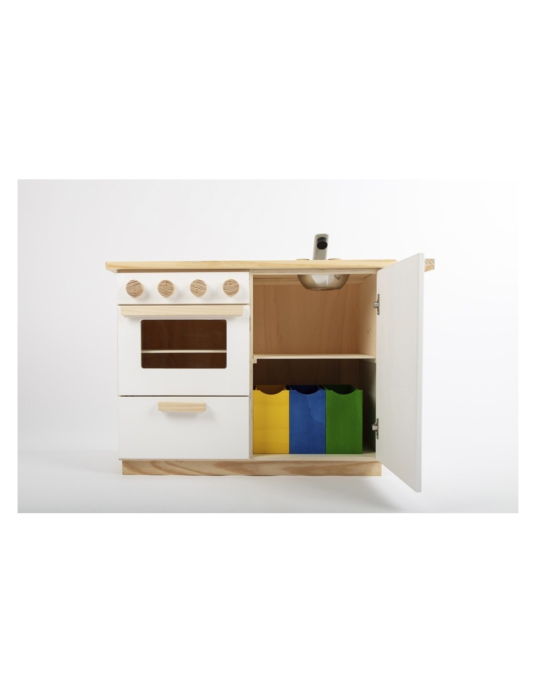 De la mà de la marca Casa Mora-Viraf, et presentem la cuina de joguina "La moderna" feta de fusta i amb un acabo amb pintura ecològica. La vitroceràmica és una pissarra i es pot dibuixar amb guix. Tots els comandaments són giratoris, l'aixeta té comandament d'aigua freda i calenta. El forn ve amb una safata extraïble i en l'armari hi ha 3 galledes dels colors de reciclatge perquè comencin a classificar des de petits. Ho té tot!