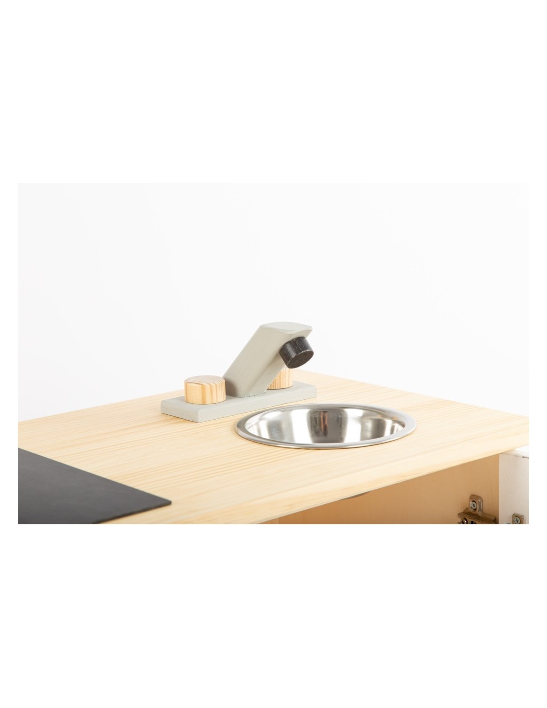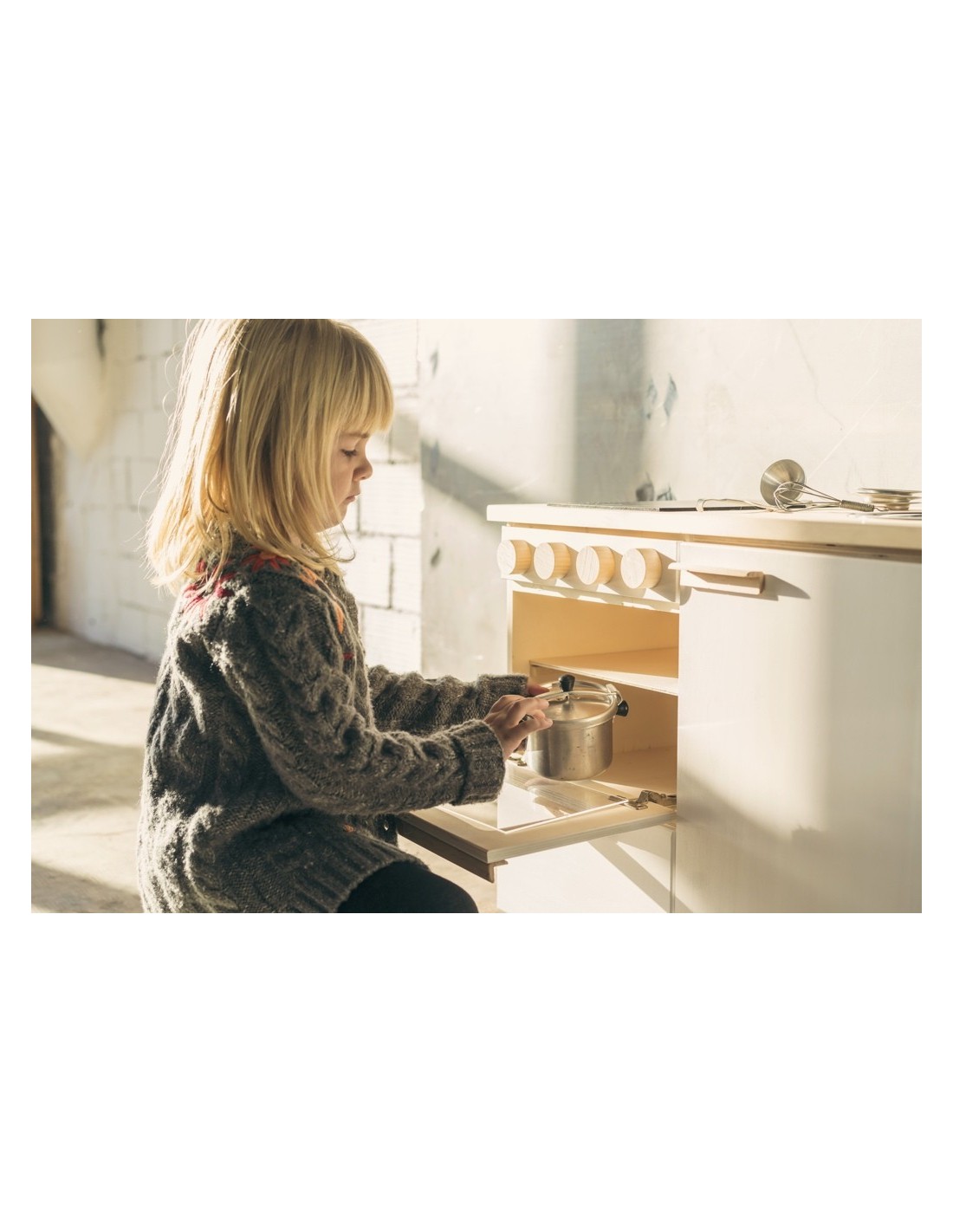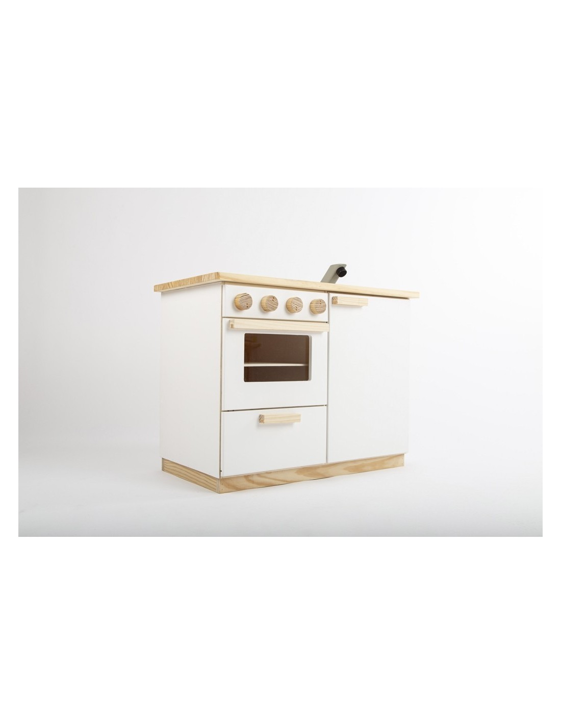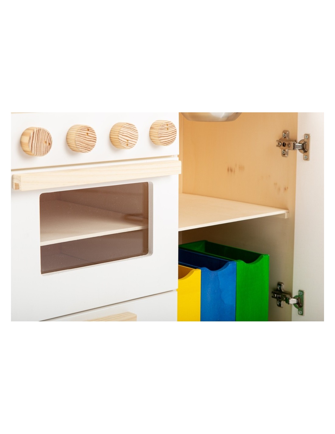 De la mà de la marca Casa Mora-Viraf, et presentem la cuina de joguina "La moderna" feta de fusta i amb un acabo amb pintura ecològica. La vitroceràmica és una pissarra i es pot dibuixar amb guix. Tots els comandaments són giratoris, l'aixeta té comandament d'aigua freda i calenta. El forn ve amb una safata extraïble i en l'armari hi ha 3 galledes dels colors de reciclatge perquè comencin a classificar des de petits. Ho té tot!