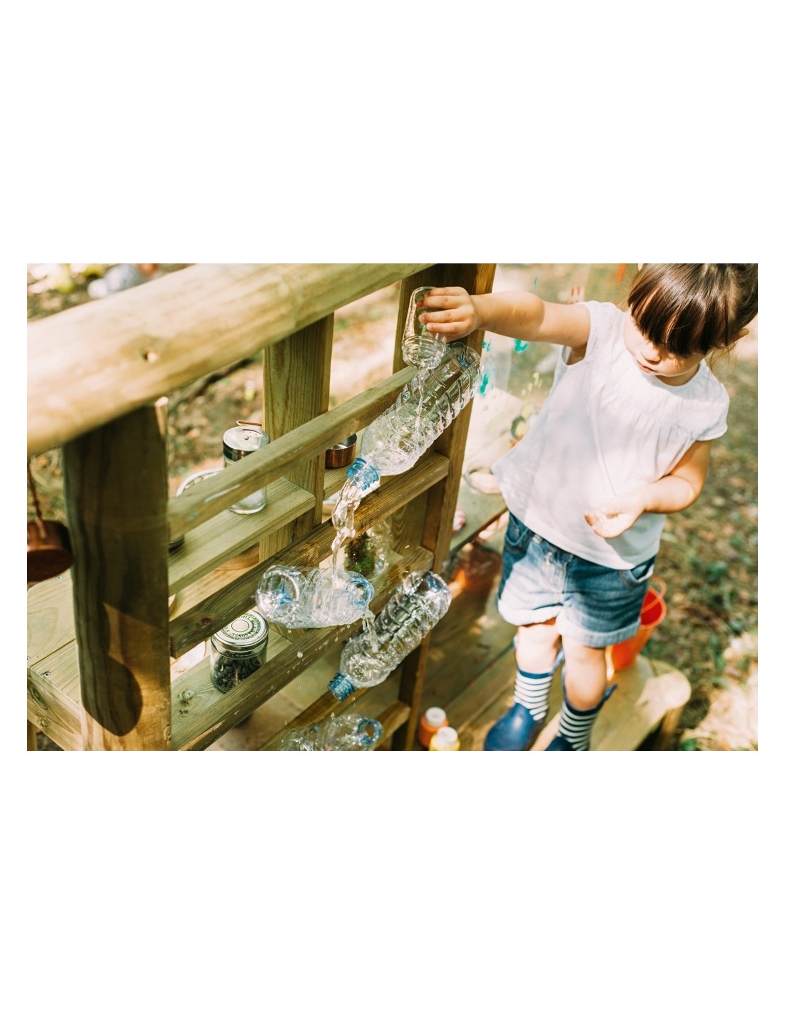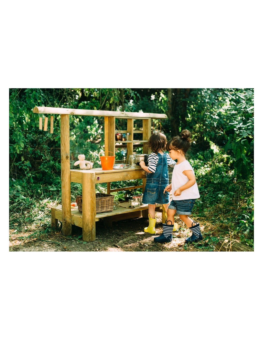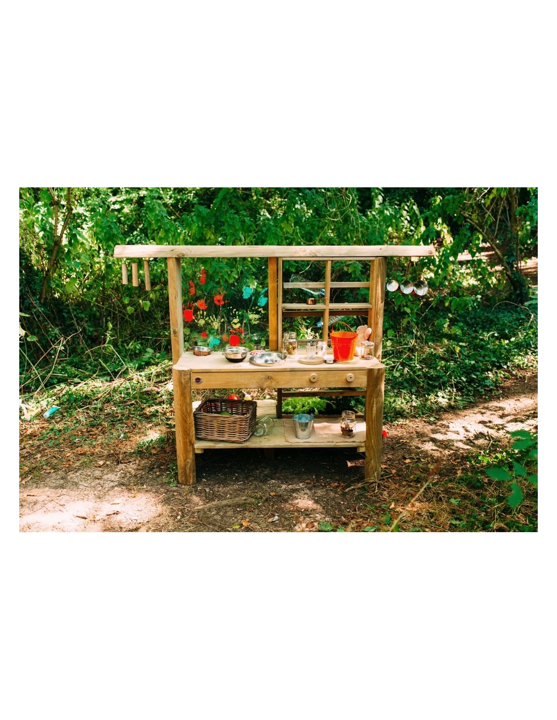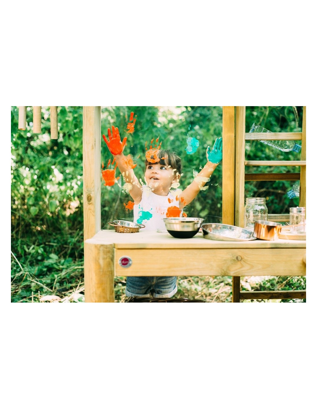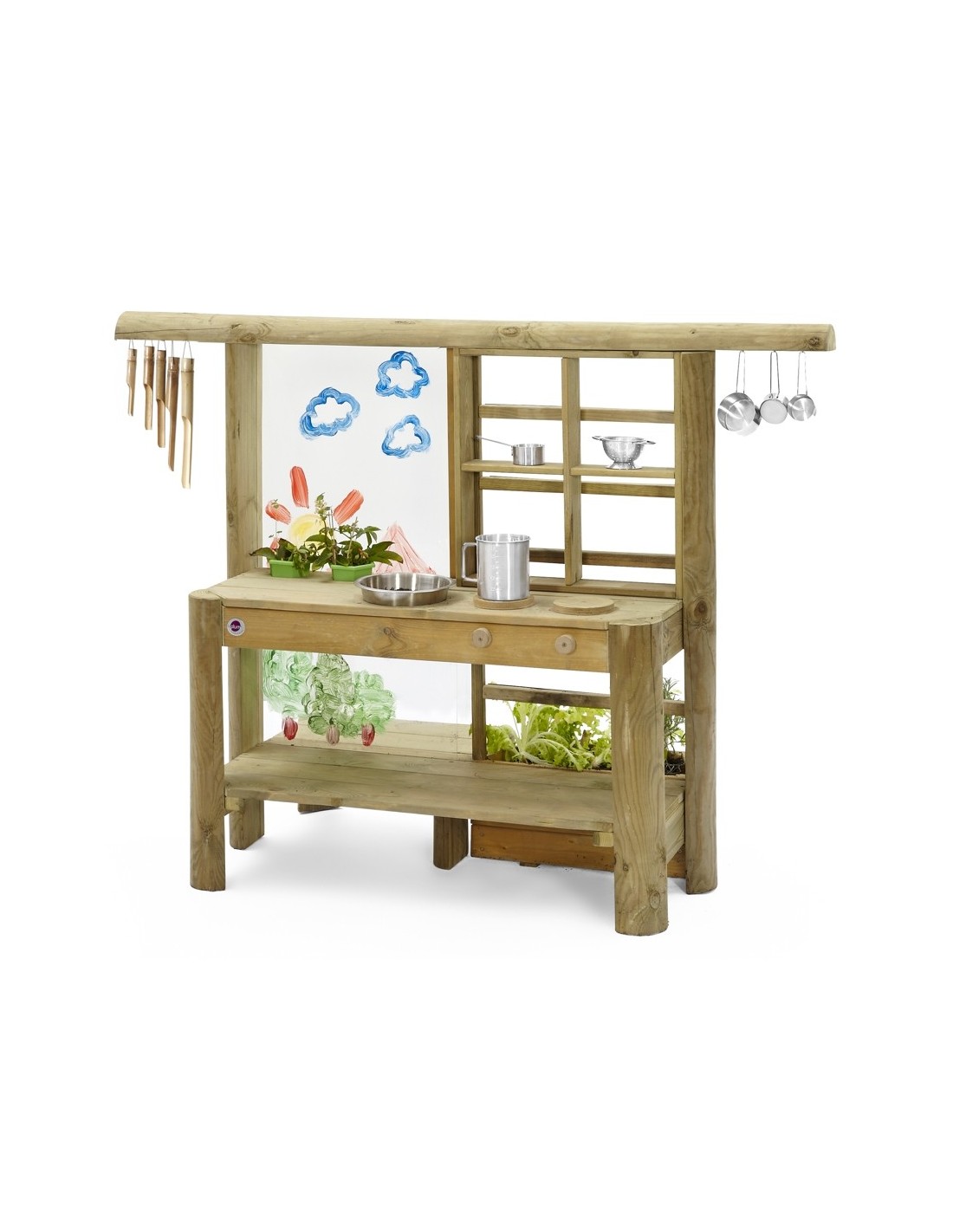 La cuineta de fusta per a exterior de Plum inclou 1 bol-pica metàl·lica, 1 pantalla fàcil de netejar, 1 mòbil campaneta de vent de bambú, suports verds per pinzells i plantes, prestatgeries i ganxos per a estris de cuina, 1 test jardinera de fusta integrada i eines i estris de cuina metàl·lics: olles, tapes, colador, cullerot ...
