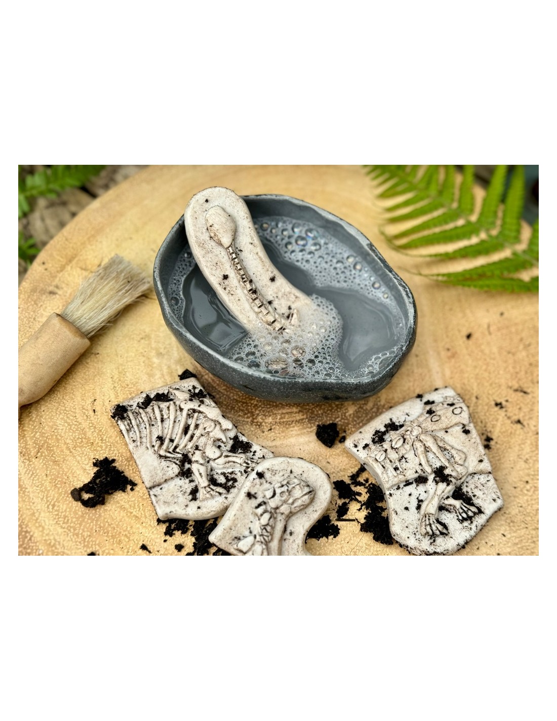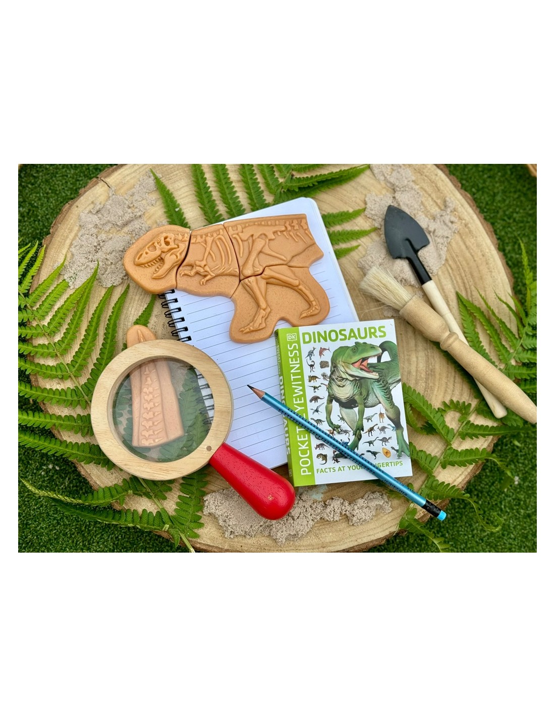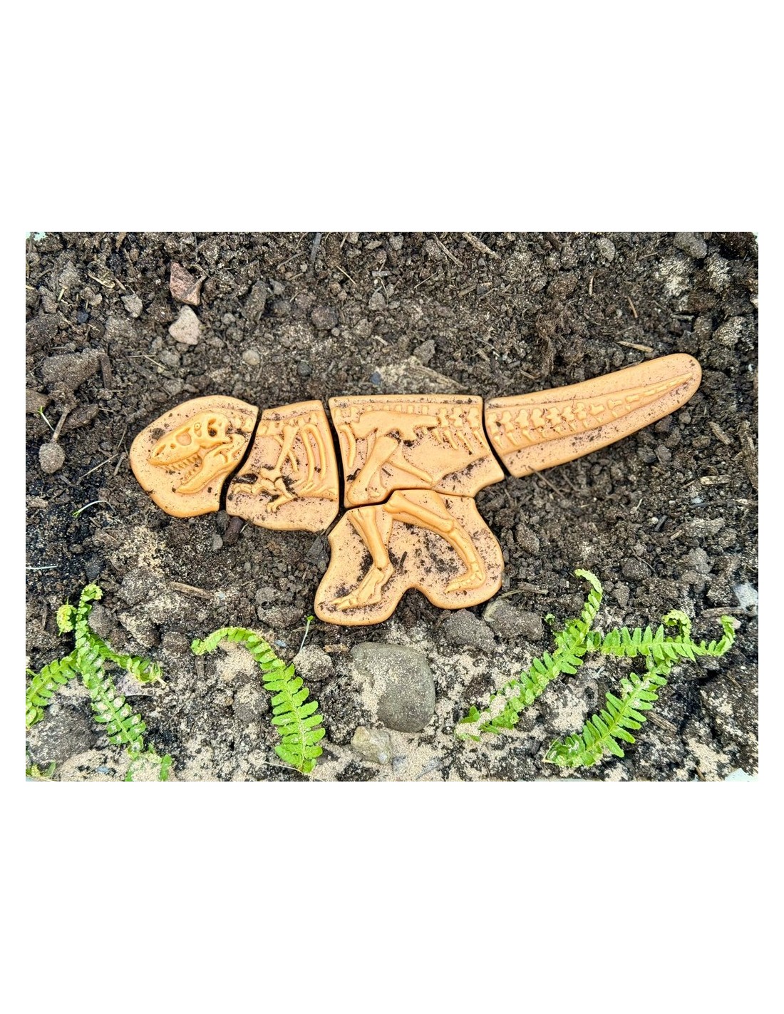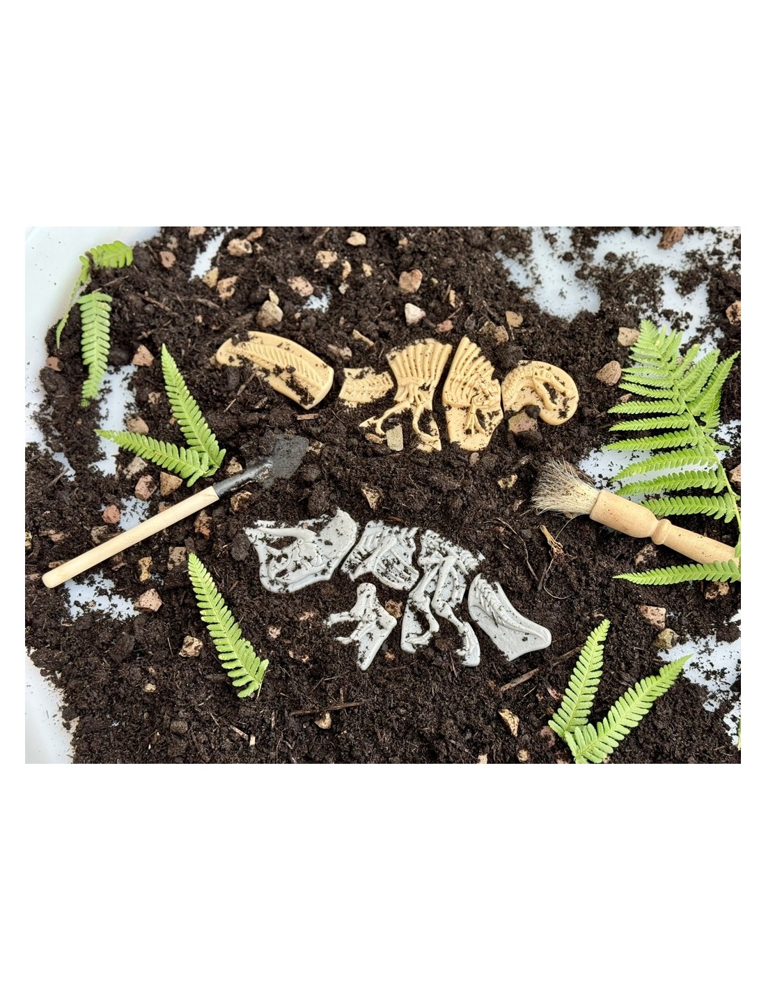 Fabricats amb una mescla de pedra duradora, els fòssils estan fets per a resistir múltiples excavacions en terra o sorra. En excavar i desenterrar les peces, els nens desenvoluparan habilitats d'observació, raonament espacial i pensament crític, ja que han d'identificar les formes i detalls de cada peça per a acoblar els esquelets. Aquest procés és una forma divertida i educativa de millorar la capacitat de concentració, atenció i resolució de problemes.