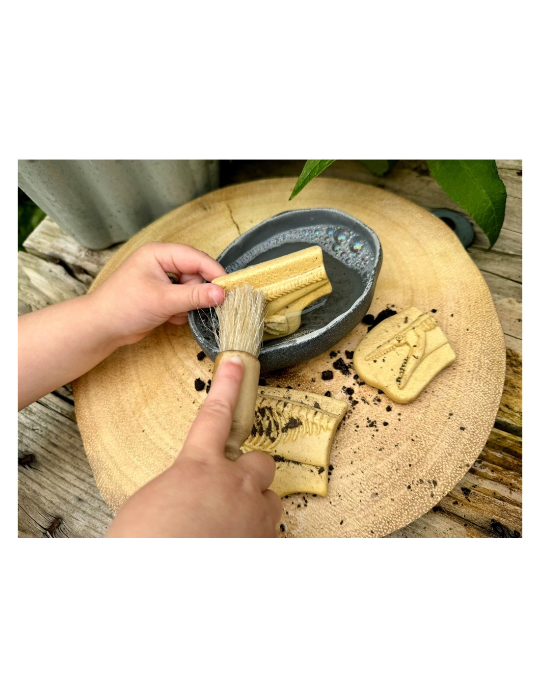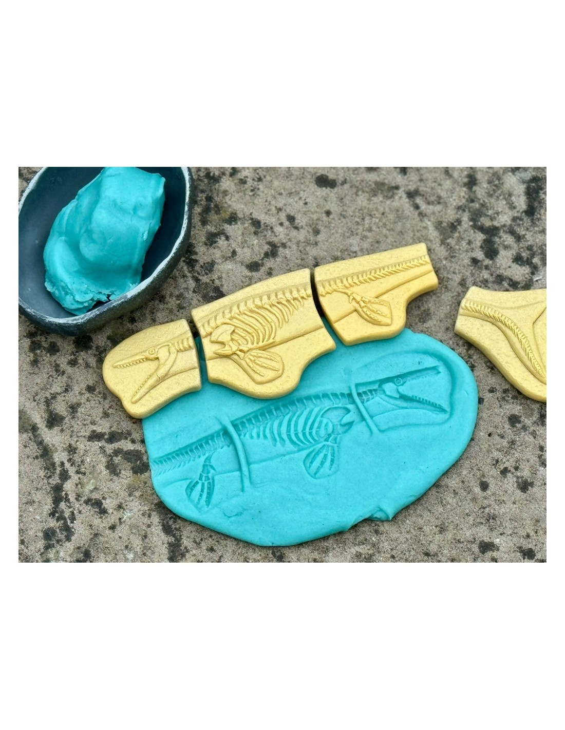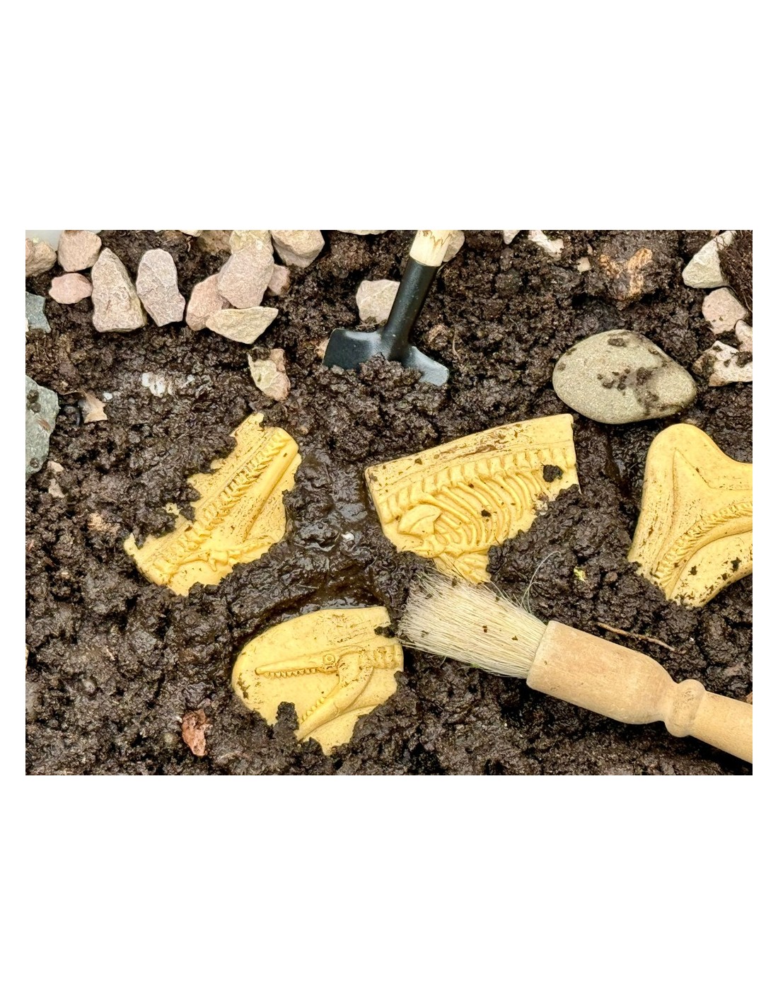 Fabricat amb una mescla de pedra duradora, aquesta joguina tàctil no sols captivarà als nens, sinó que també els ajudarà a desenvolupar habilitats importants com la consciència espacial, el pensament crític i l'observació. Cadascun dels esquelets està compost per un nombre diferent de peces, la qual cosa ofereix dos reptes emocionants perquè els nens puguin construir cada figura progressivament. A més, el fet de manipular les peces en la seva cerca dels fòssils els permet desenvolupar destreses motrius fines, ja que han d'anar amb compte en excavar i acoblar les peces.