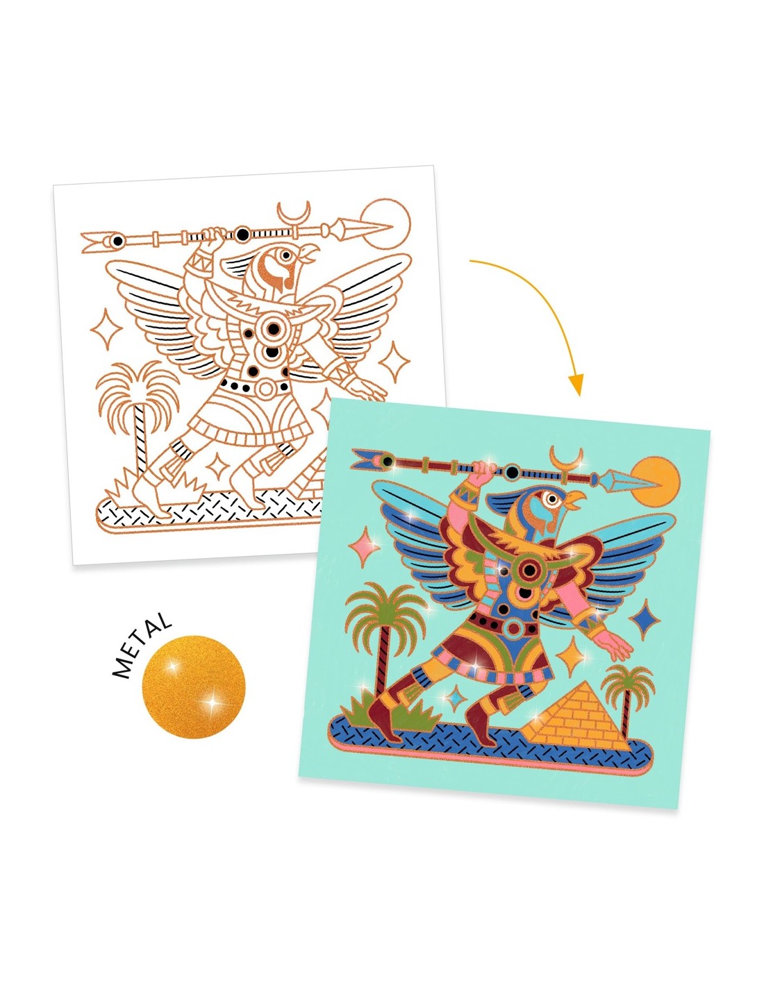 Embarca't en un viatge a la fascinant època dels faraons amb Dibuixos Brillants - Animals Guerrers, una captivadora carpeta que ofereix una activitat pictòrica única per a nens de 5 a 8 anys. Aquest kit emocionant convida els petits artistes a submergir-se en la història d'Egipte mentre pinten quatre quadres decorats amb pintura daurada, capturant l'essència dels animals guerrers que van protagonitzar aquells temps antics.