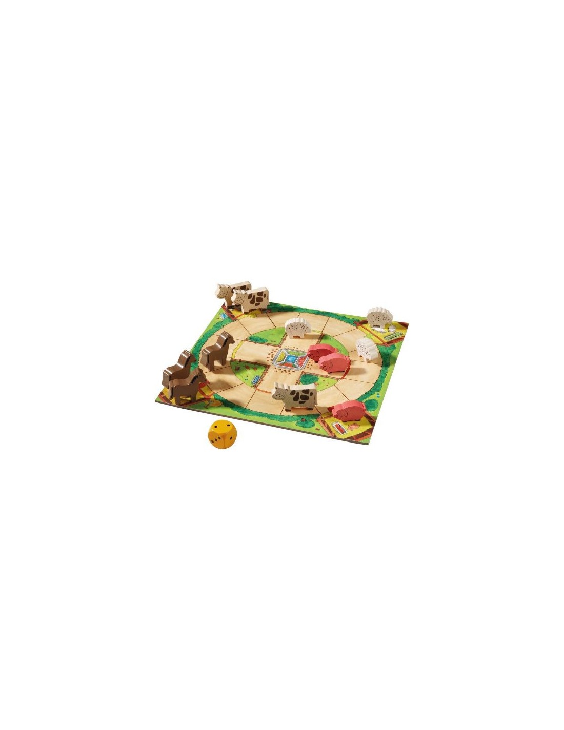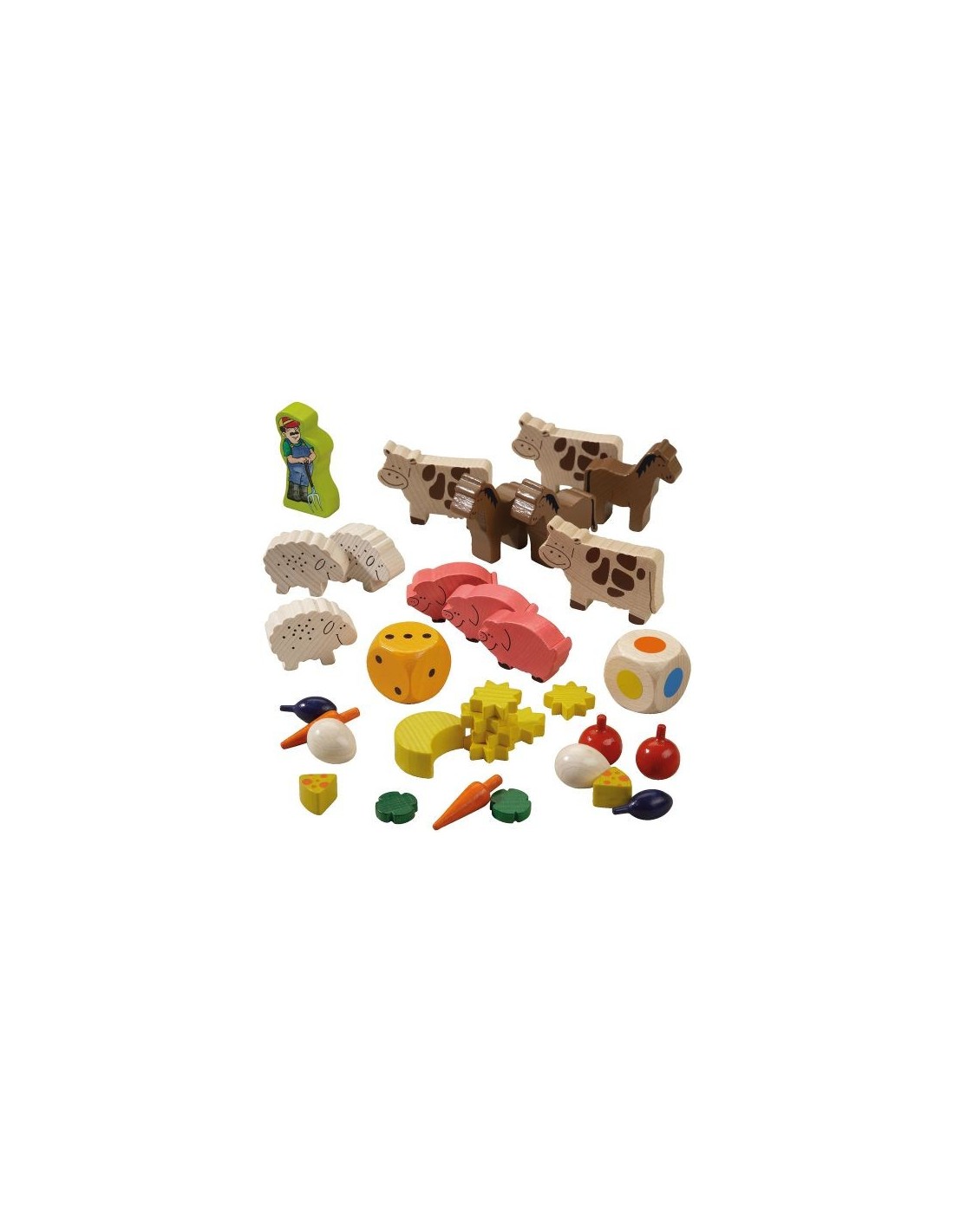 Contingut: 3 cavalls, 3 vaques, 3 porcs, 3 ovelles, 2 pomes vermelles, 2 prunes, 2 ous, 2 trossos de formatge, 2 fulles d'enciam, 2 pastanagues, 1 pagès, 1 dau de punts, 1 dau de colors, 9 estrelles, 1 lluna, 1 llibret d'instruccions dels jocs.