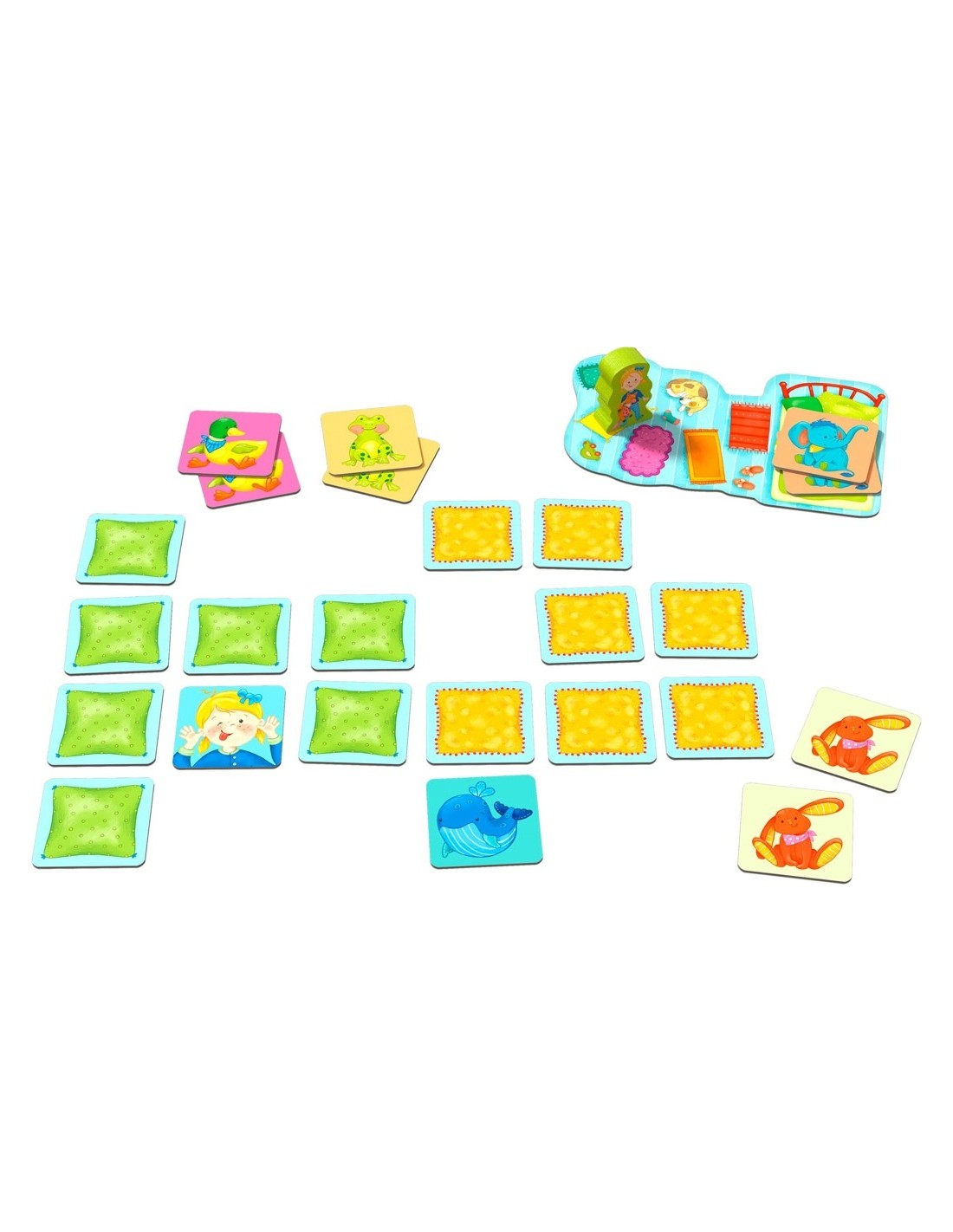 Dins de la caixa de Memo amb Maxi d'Haba trobareu 1 tauler d'habitació infantil, 1 figureta de Maxi i 24 fitxes Memo.
