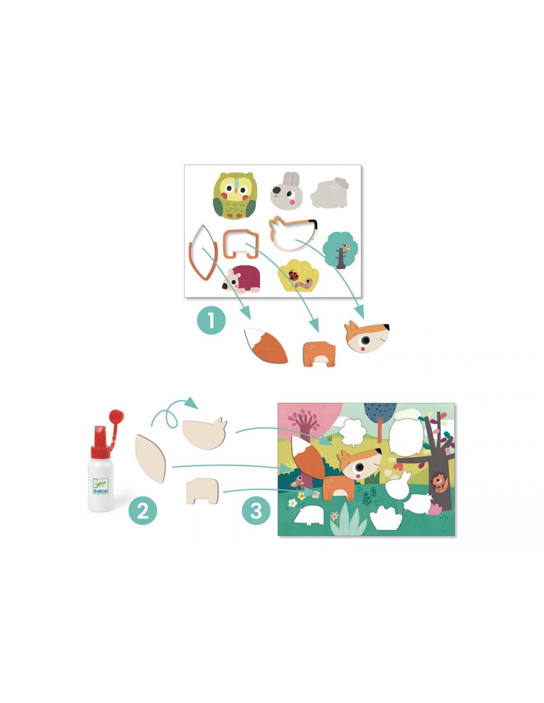 Contingut: 4 cartolines gruixudes i il·lustrades (21 x 28 cm), 4 fulles de cartolina gruixuda, il·lustrades i precortadas, 1 tub de cua i 1 llibret explicatiu a color.