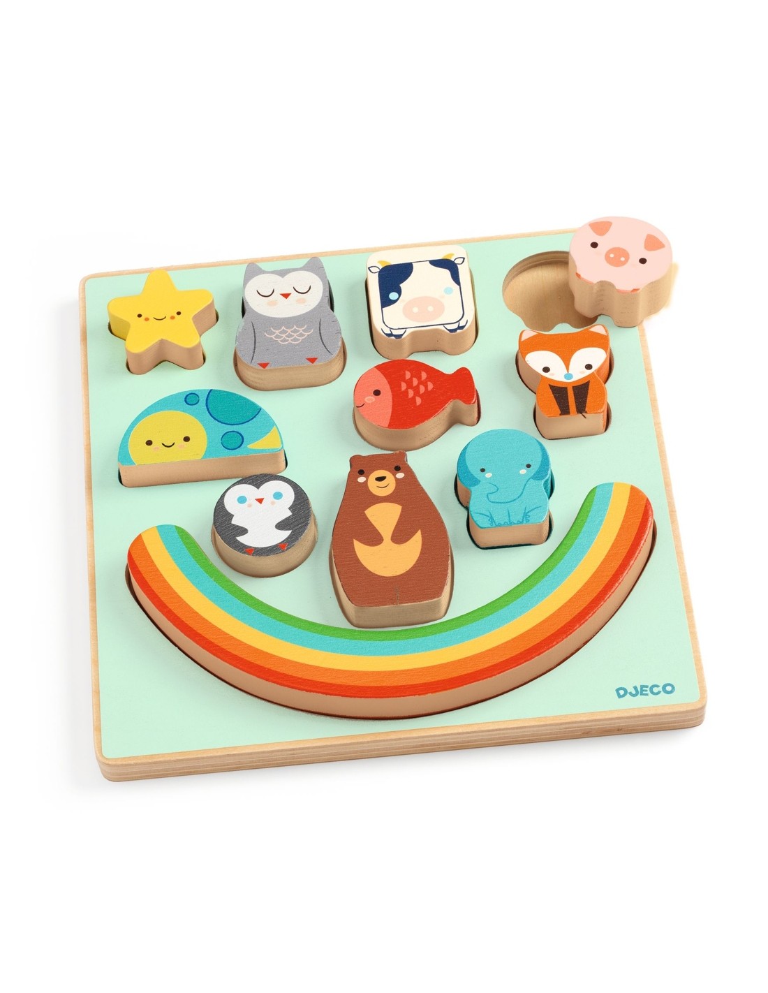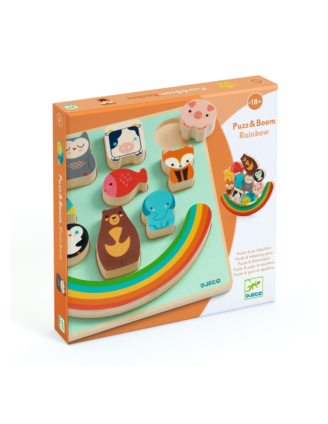 Amb Puzz & Boom Rainbow, els petits poden gaudir de la diversió clàssica d'encaixar peces de fusta amb formes a la base, fomentant el reconeixement de formes i colors mentre completen el puzle. Però la diversió no s'hi atura, ja que també poden explorar l'emocionant desafiament d'equilibrar els animals sobre l'arc de Sant Martí. Aquesta modalitat no només millora les habilitats motores fines, sinó que també promou la paciència i la coordinació.