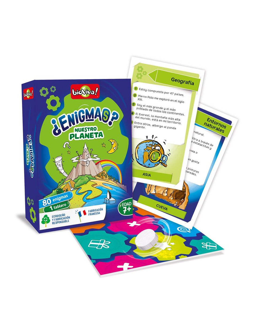 Enigmas Nuestro planeta és un joc didàctic i summament divertit que et submergeix en les fascinants característiques del nostre planeta Terra! Aprendràs jugant una varietat d'aspectes sobre la nostra llar planetària, i el millor és que podràs portar-ho amb tu on vulguis gràcies al seu format de viatge.