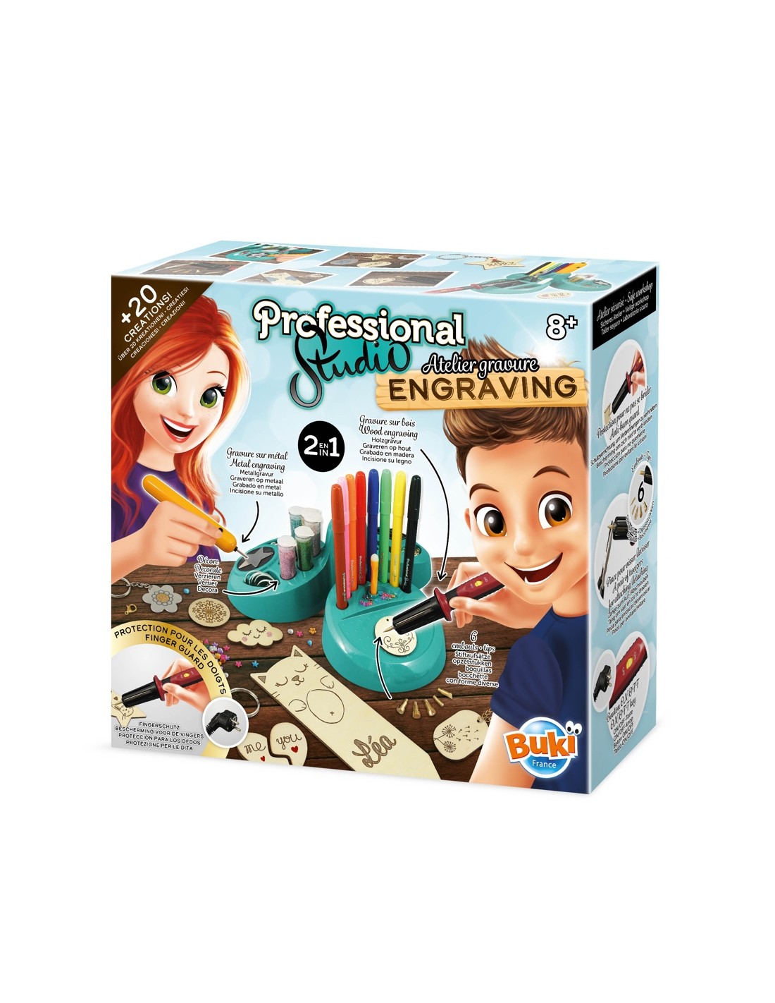 Vols descobrir el fascinant món del gravat i la personalització d'objectes? Amb aquest Estudi Professional de Gravats, podràs dissenyar i crear les teves pròpies peces en fusta i metall, de manera segura i divertida. Aquest set et permet elaborar fins a 5 imants, 5 clauers, 10 collarets i 1 marcapàgines, transformant materials simples en autèntiques obres d'art.