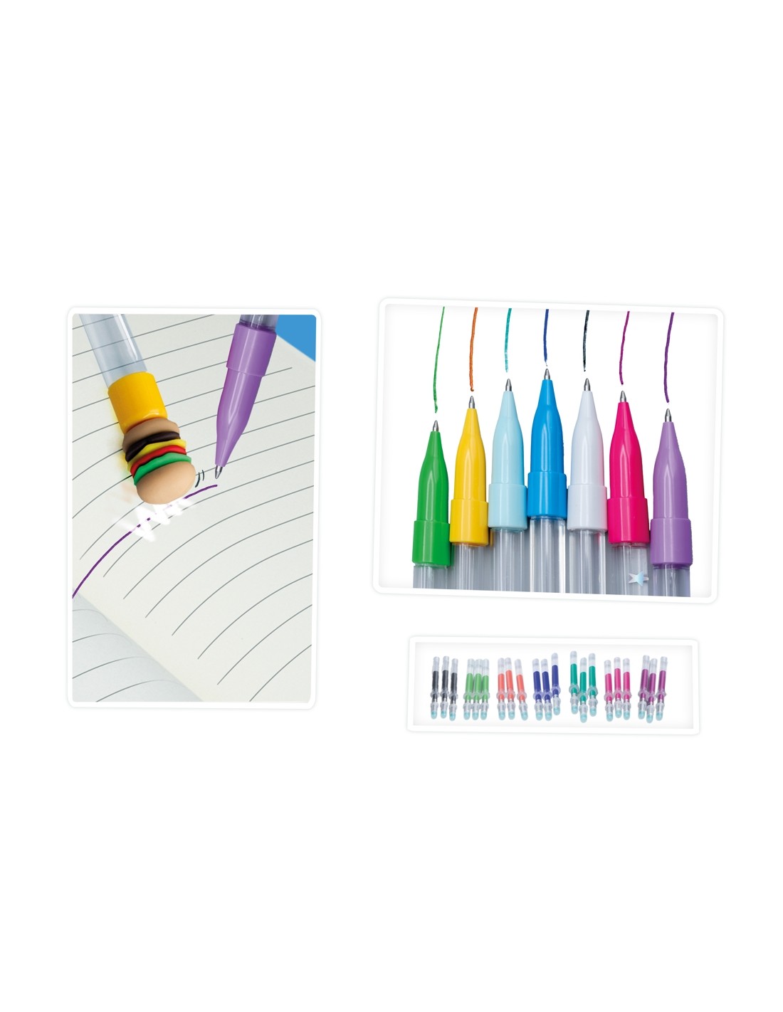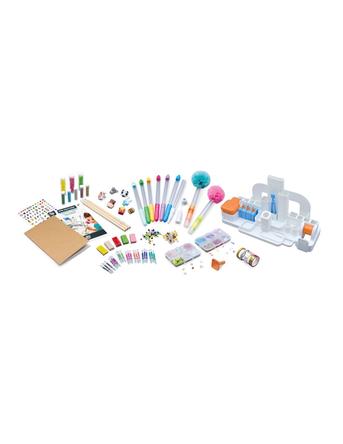 El lot inclou tot el necessari perquè cada nen pugui donar curs a la seva creativitat: 7 bolígrafs, 21 recanvis de tinta esborrables en 7 colors diferents, 2 subratlladors, 3 llapis, 1 quadern A5, 4 rotllos de cinta adhesiva, 1 full d'adhesius, 5 colors d'argila per a esborrar, 3 motlles per a gomes d'esborrar, 7 figuretes, 1 caixa de lluentons, 1 caixa de decoracions de colors, 2 pompons grans, 5 tubs de minilluentons, 3 pompons petits, comptes, 1 joc de pinces/cullera, 1 embut i un full d'instruccions il·lustrades.