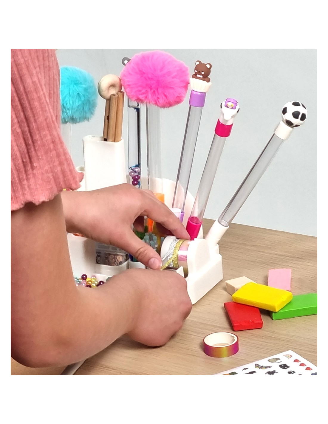 Per a començar, només cal col·locar un bolígraf en l'estació, inserir l'embut i omplir-lo amb les decoracions que més els agradin. A més, poden decorar els llapis amb adhesius i crear les seves pròpies gomes d'esborrar personalitzades amb els motlles i argiles incloses. Fins i tot el quadern proporcionat pot ser personalitzat utilitzant la cinta d'emmascarar, convertint-ho en un accessori únic i ple d'estil.