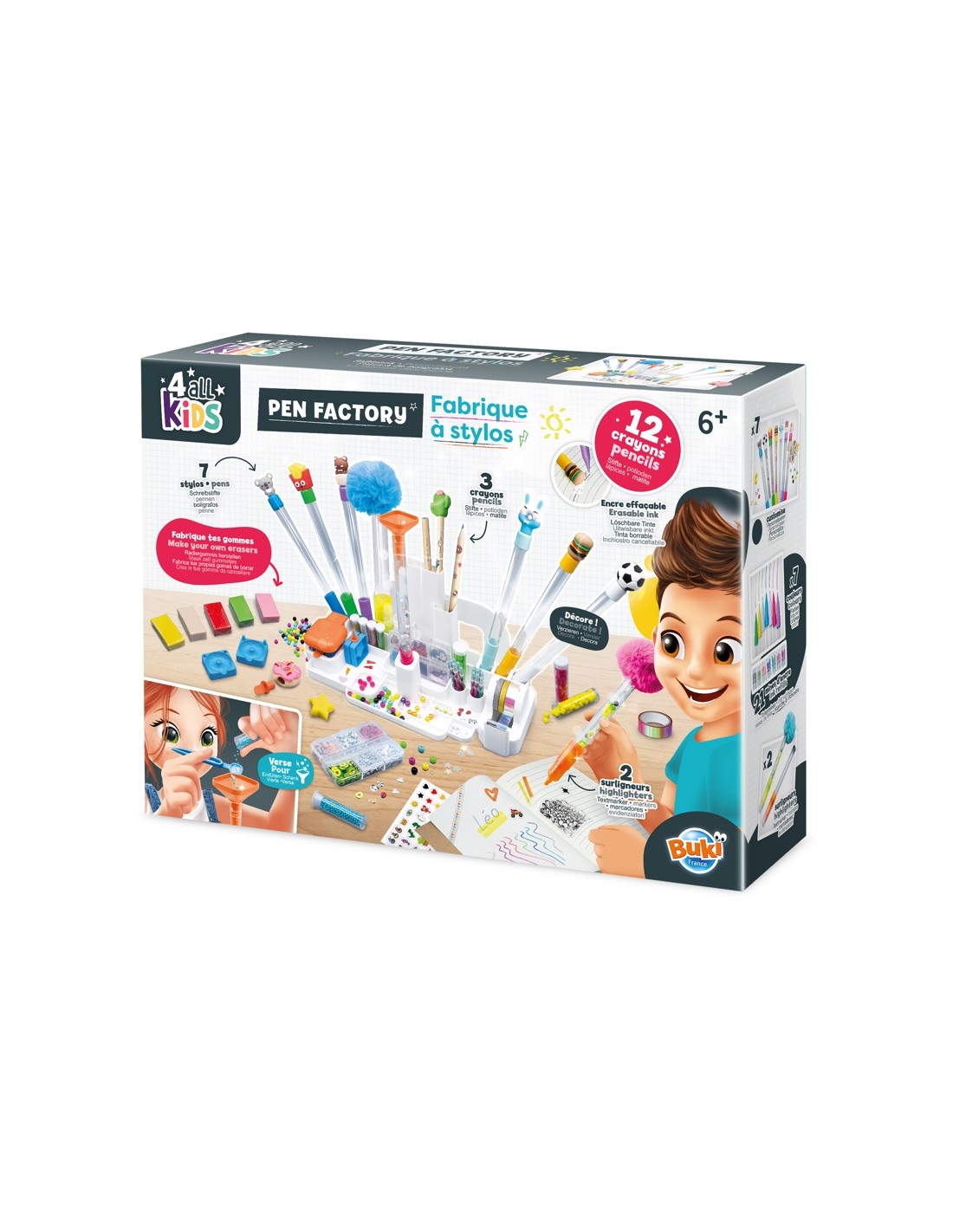 Amb la Fàbrica de Bolígrafs de Buki, els nens i nenes poden convertir-se en autèntics dissenyadors del seu propi escriptori. Aquest set els permet personalitzar 12 bolígrafs i altres útils d'oficina de manera divertida i creativa, fomentant la imaginació i l'expressió personal mentre aprenen a organitzar els seus materials.