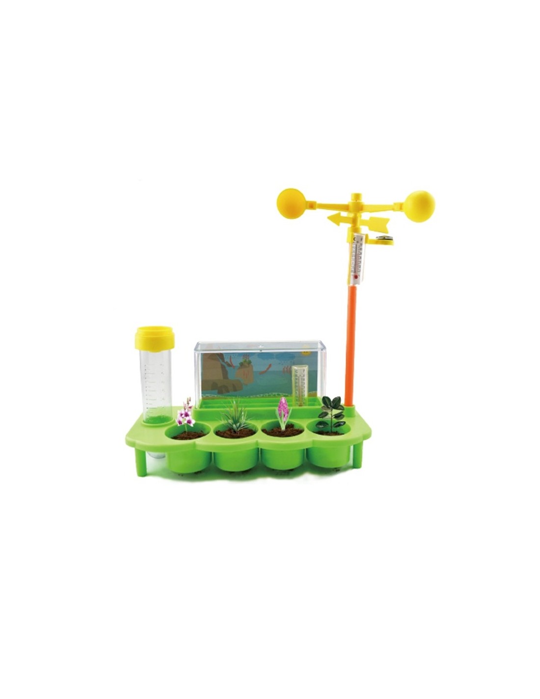 Crea el teu propi mini jardí botànic amb estació meteorològica i aprèn sobre la mesura i direcció del vent, la temperatura de l'aire, la temperatura de l'aigua, la recirculació de l'aigua de pluja i observa com creixen les plantes, com a resultat.
