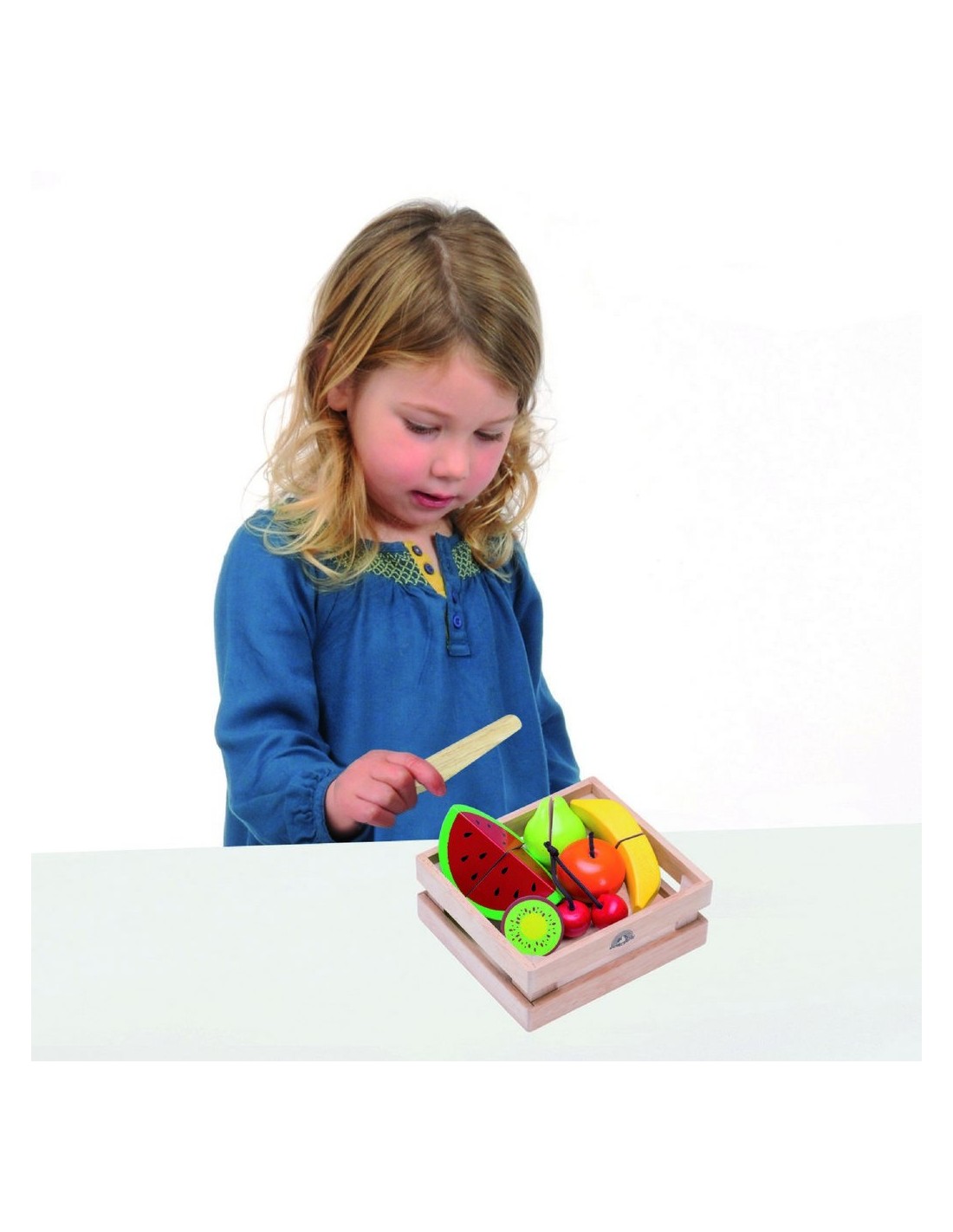 Una fantàstica cistella de fruites que, a més de ser usada per a jugar, també ajudarà el vostre nen a aprendre sobre els colors, formes i noms de les fruites. Les peces, unides per velcro, podran ser "tallades" una vegada i una altra. Complement ideal per a joguines com cuinetes, bàscules, caixes registradores... És genial!