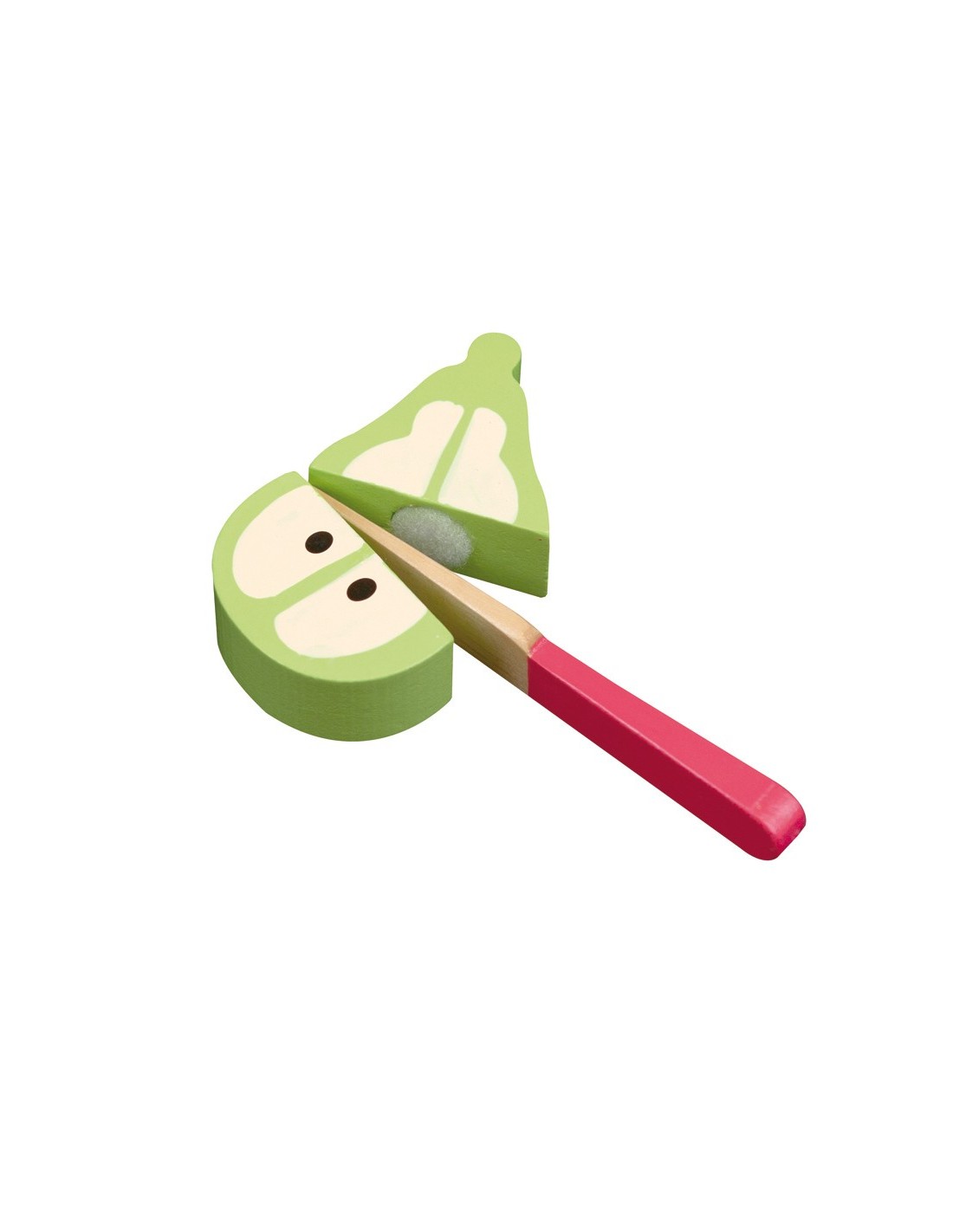 Conjunt de fruites de fusta per tallar. Aquest joc està format per 4 fruites: una maduixa, un plàtan, una pera i una síndria. Totes elles estan tallades per la meitat i les parts estan unides amb velcro. Al passar el gavinet de fusta pel mig de la fruita, es separen les dos parts com si l'estiguessim tallant. Les fruites i el ganivet es serveixen en una bonica safata de fusta. Un dels jocs més existosos de la nostra botiga online.