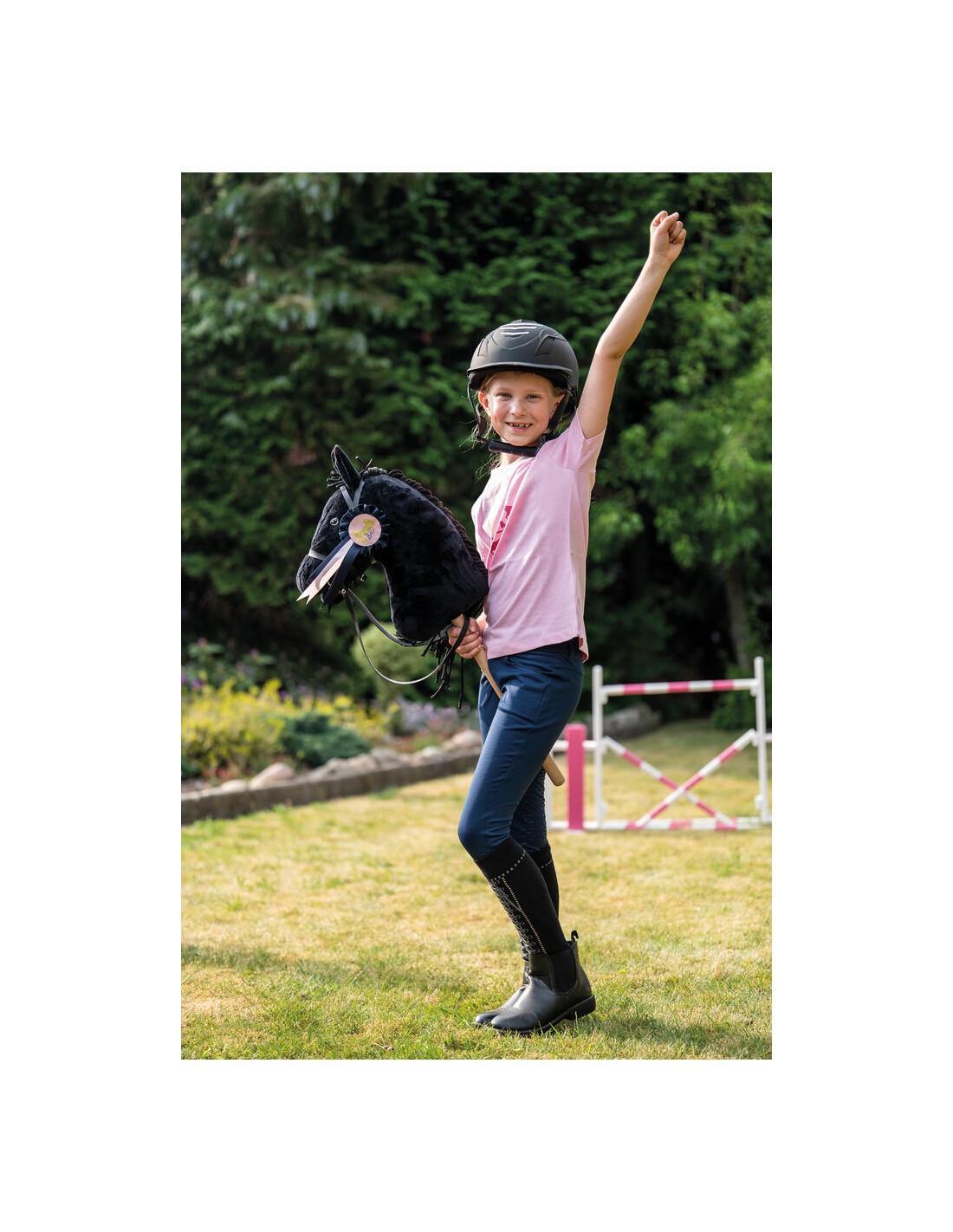 Confeccionada en una elegant combinació de blau marí i rosa, l'escarapel·la destaca pel seu disseny cuidat i els seus acabats de qualitat. Està pensada per a col·locar-se fàcilment en la brida o en l'abillament del genet, aportant un aire de celebració i orgull a cada moment del joc. La seva estètica refinada la converteix en un detall ideal per a premiar assoliments, reconèixer avanços o simplement decorar l'equip del cavall de pal.