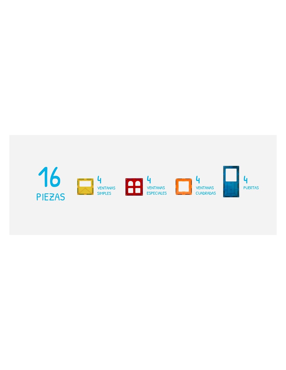 Imanix portes i finestres inclou 4 portes de 15 x 7,5 x 0,7 cm.,4 finestres simples de 7,5 x 7,5 x 0,7 cm., 4 finestres quadrades de 7,5 x 7,5 x 0,7 cm., 4 finestres especials de 7,5 x 7,5 x 0,7 cm.