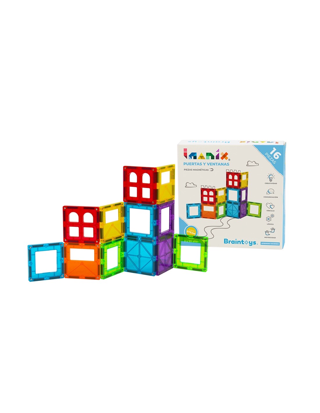 Imanix Portes i Finestres és un joc de Braintoys amb 16 peces translúcides de portes i finestres de colors. Amb ell, podreu construir formes 2D i 3D, donant curs a la vostra imaginació i creativitat. Podeu crear castells, cotxes, figures planes… Tot el que pugueu imaginar! I per descomptat, tractant-se d'un joc STEM, també podreu crear números, lletres, fraccions…