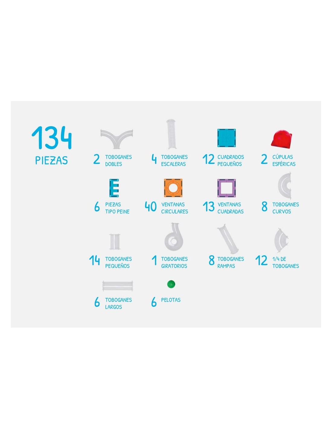 Aquest set de 134 peces inclou una varietat de components, com a tobogans dobles, escales, tobogans corbs, tobogans rampes, quadrats petits, cúpules esfèriques, peces tipus pentini, finestres circulars i quadrades, així com sis pilotes per a afegir un element d'acció a la diversió.