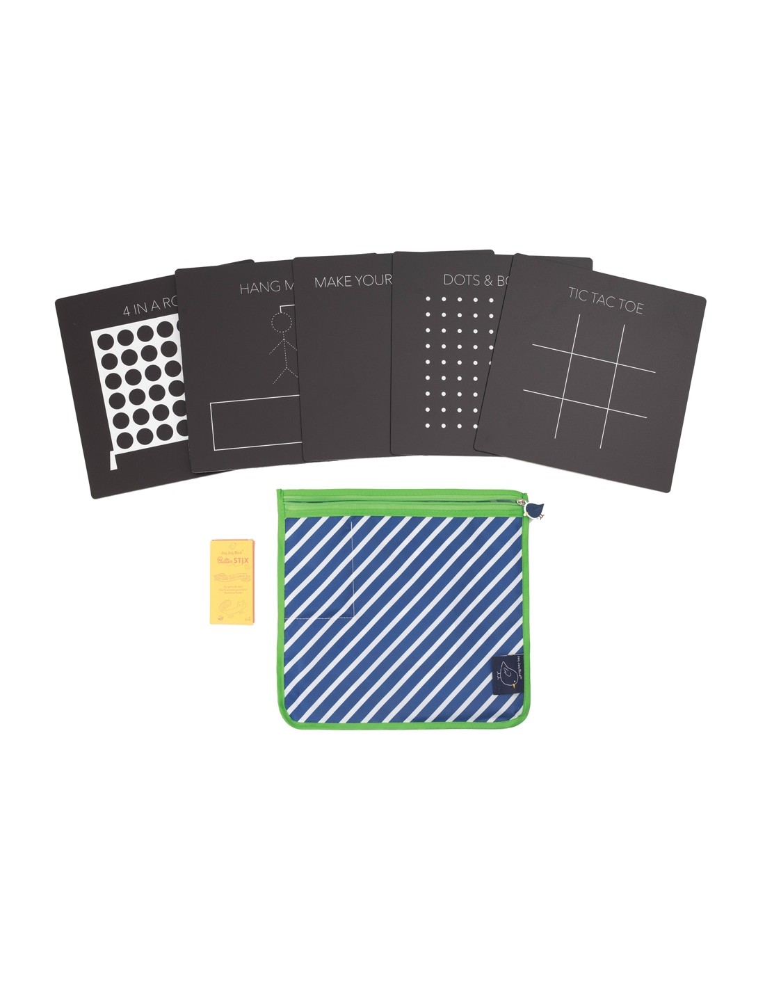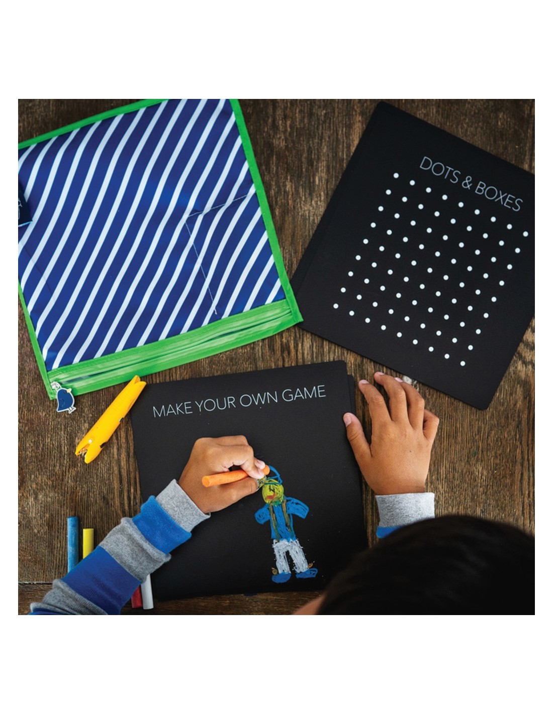 El lot inclou 4 ButterStix®, uns guixos de textura mantegosa que no generen pols i no embruten, per la qual cosa resulten ideals per a mans petites i entorns on es busca neteja. Aquests guixos es llisquen amb suavitat sobre les superfícies no poroses de les pissarres i ofereixen una consistència pastís que permet controlar el traç i barrejar colors sense riscos ni restes. Tot el conjunt es guarda en un estoig amb cremallera, compacte i resistent, que protegeix les peces i facilita el seu transport.